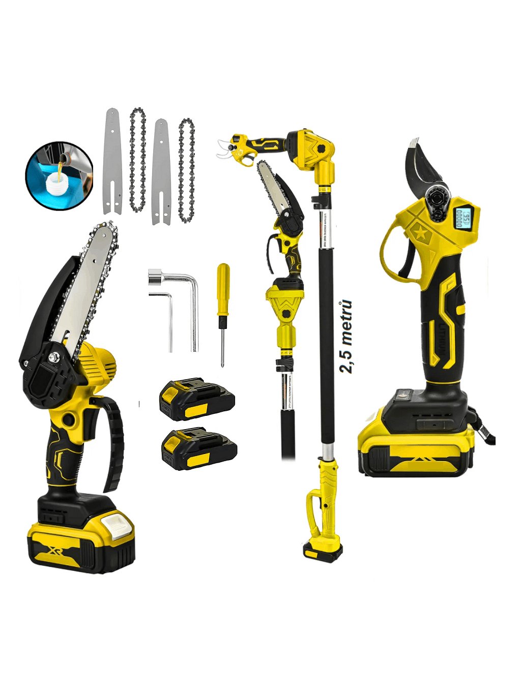 AKU sada zahradního nářadí – Pilka, nůžky, teleskopická tyč, 2 lišty a 2 řetězy