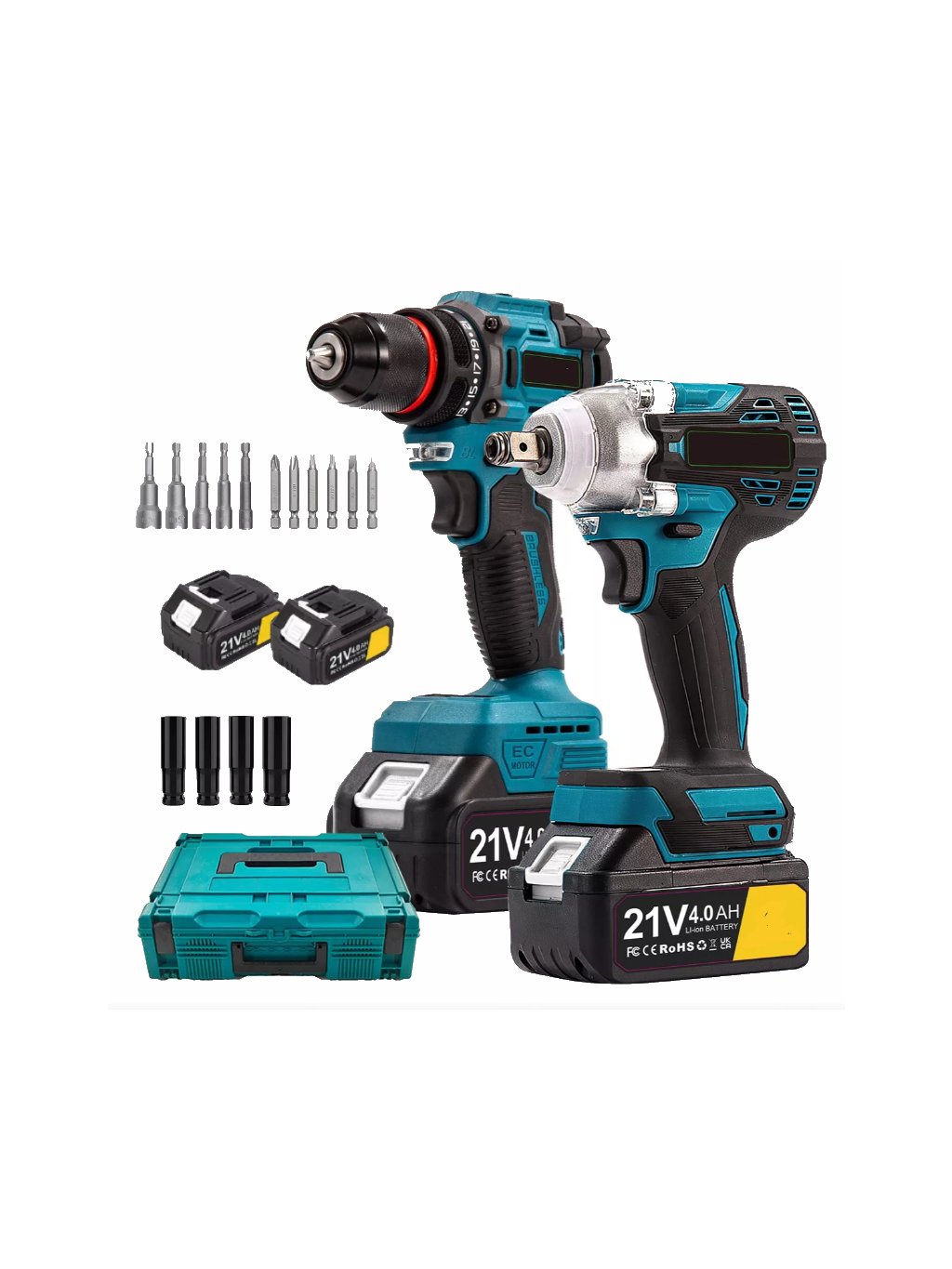 Sada aku nářadí – Rázový utahovák + Vrtačka s příklepem + 2× baterie 21V
