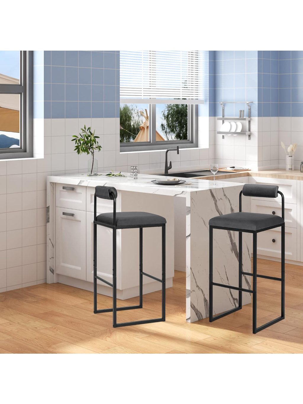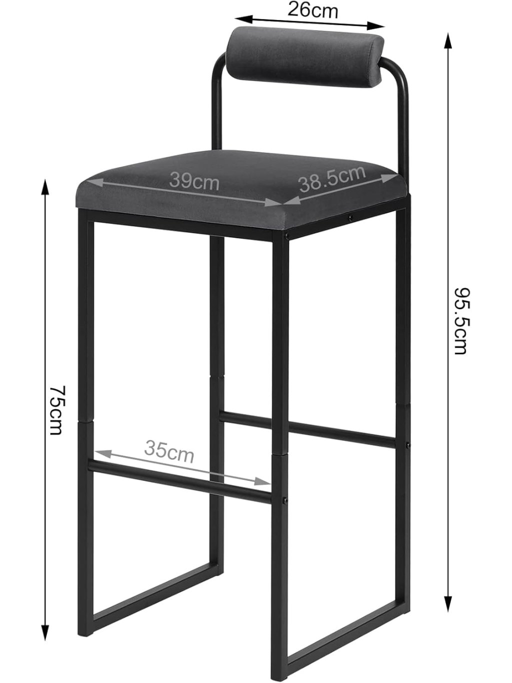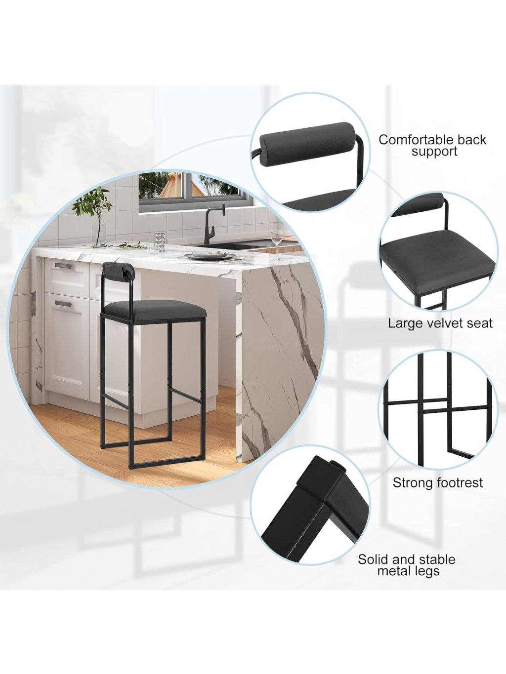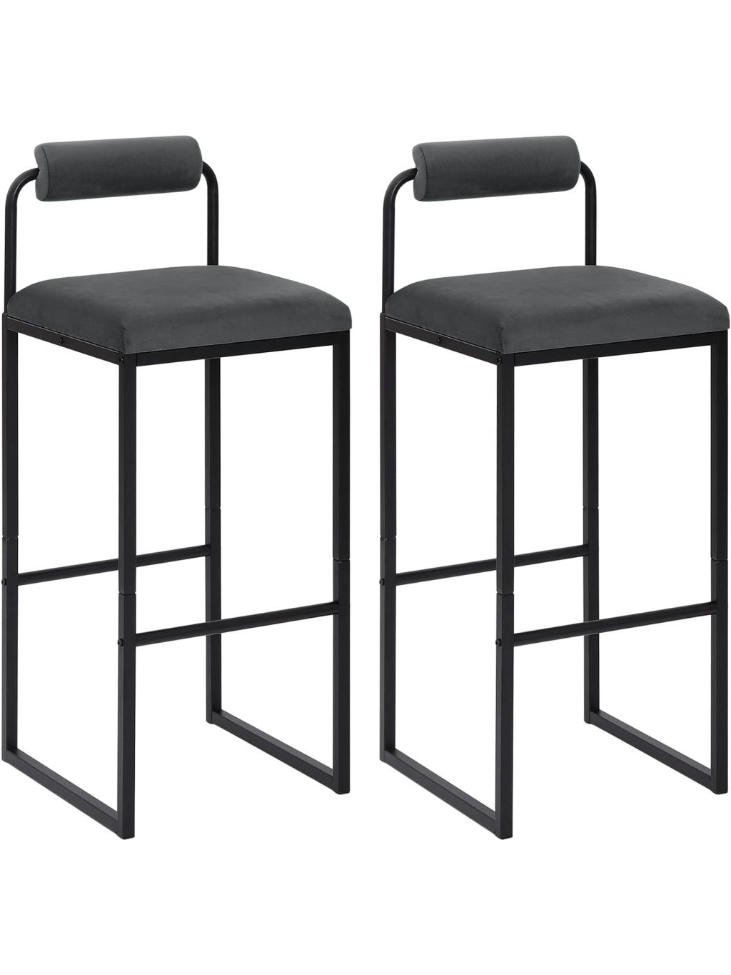 Barové židle s opěrkou a opěrkou nohou, čalouněné sametem, tmavě šedé – sada 2 ks (WOLTU BH343dgr-2)