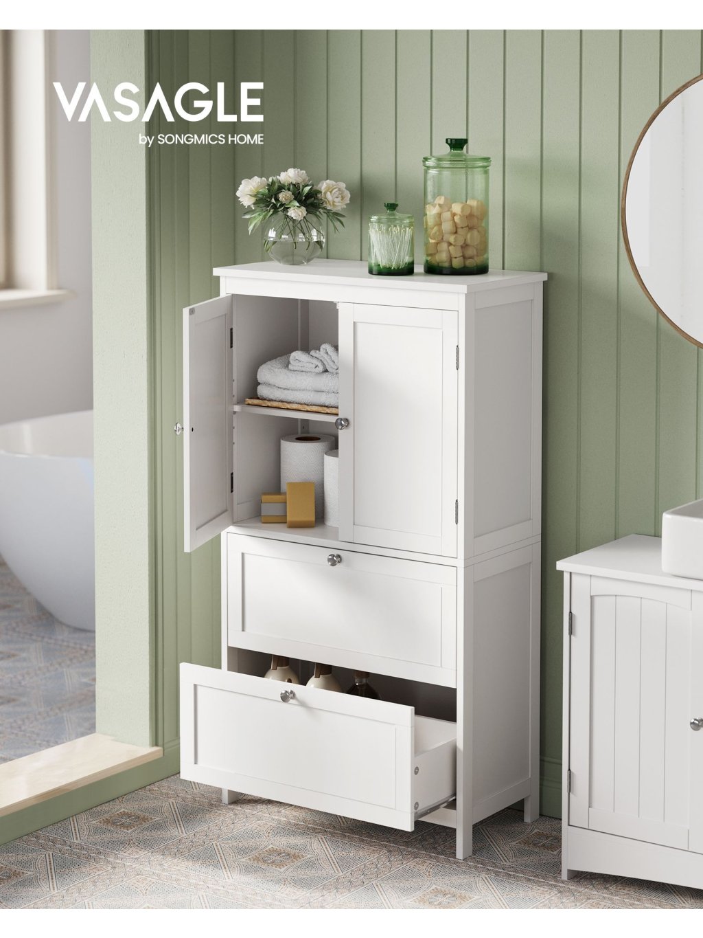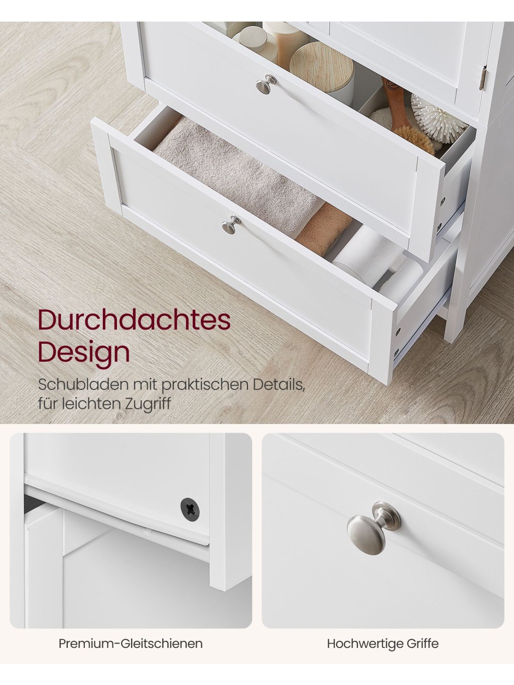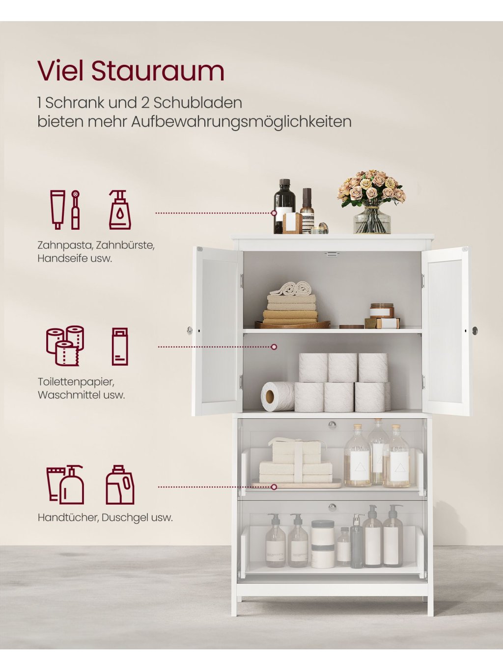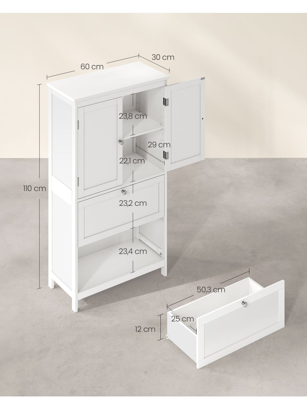 Volně stojící koupelnová skříňka se 2 zásuvkami a 2 dvířky – bílá, 30 × 60 × 110 cm