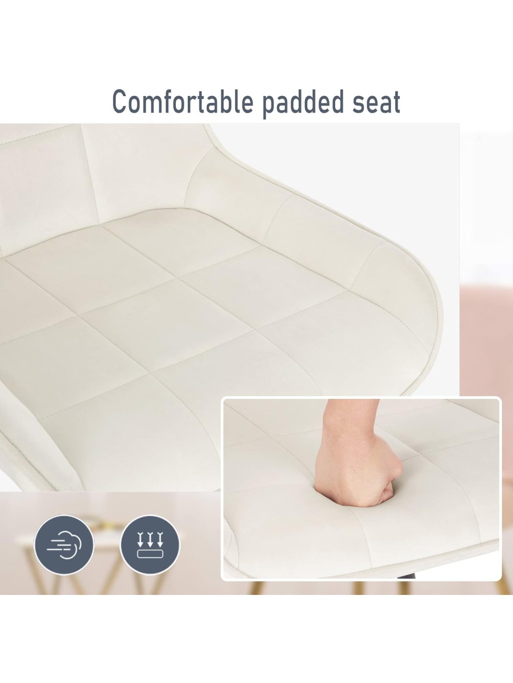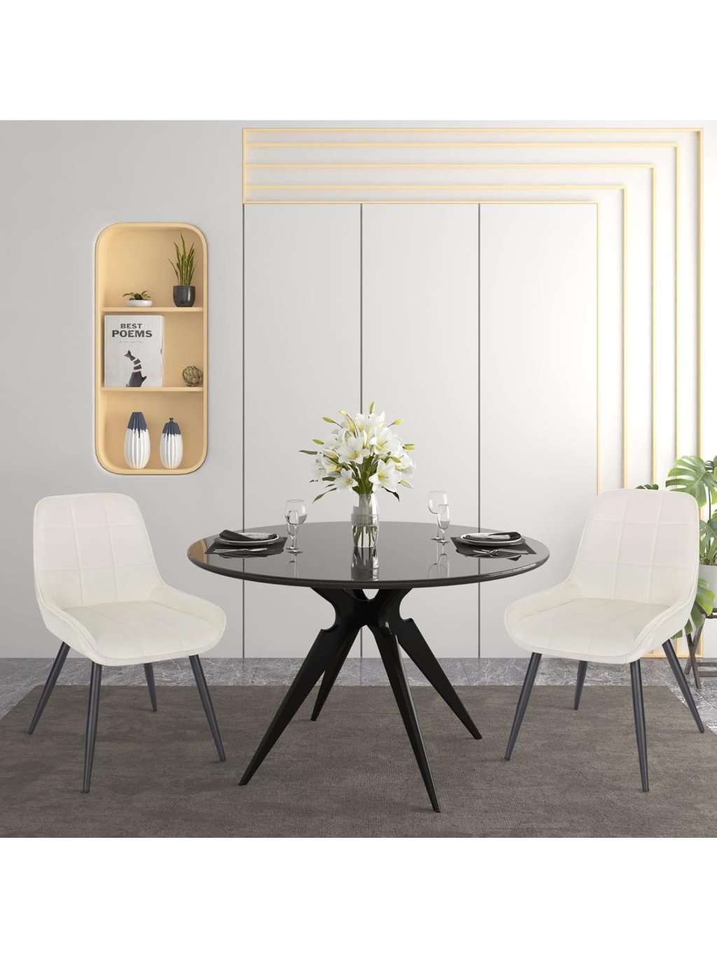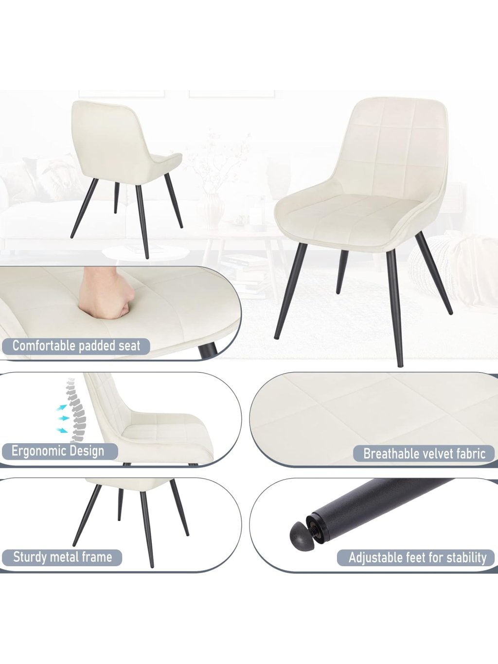Tyto elegantní jídelní židle v krémově bílém provedení kombinují moderní vzhled, pohodlné sezení a pevnou konstrukci. Jsou vhodné do jídelny, kuchyně, obývacího pokoje, ložnice i domácí kanceláře.