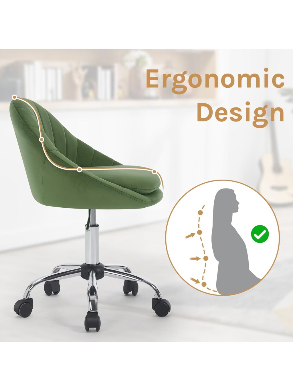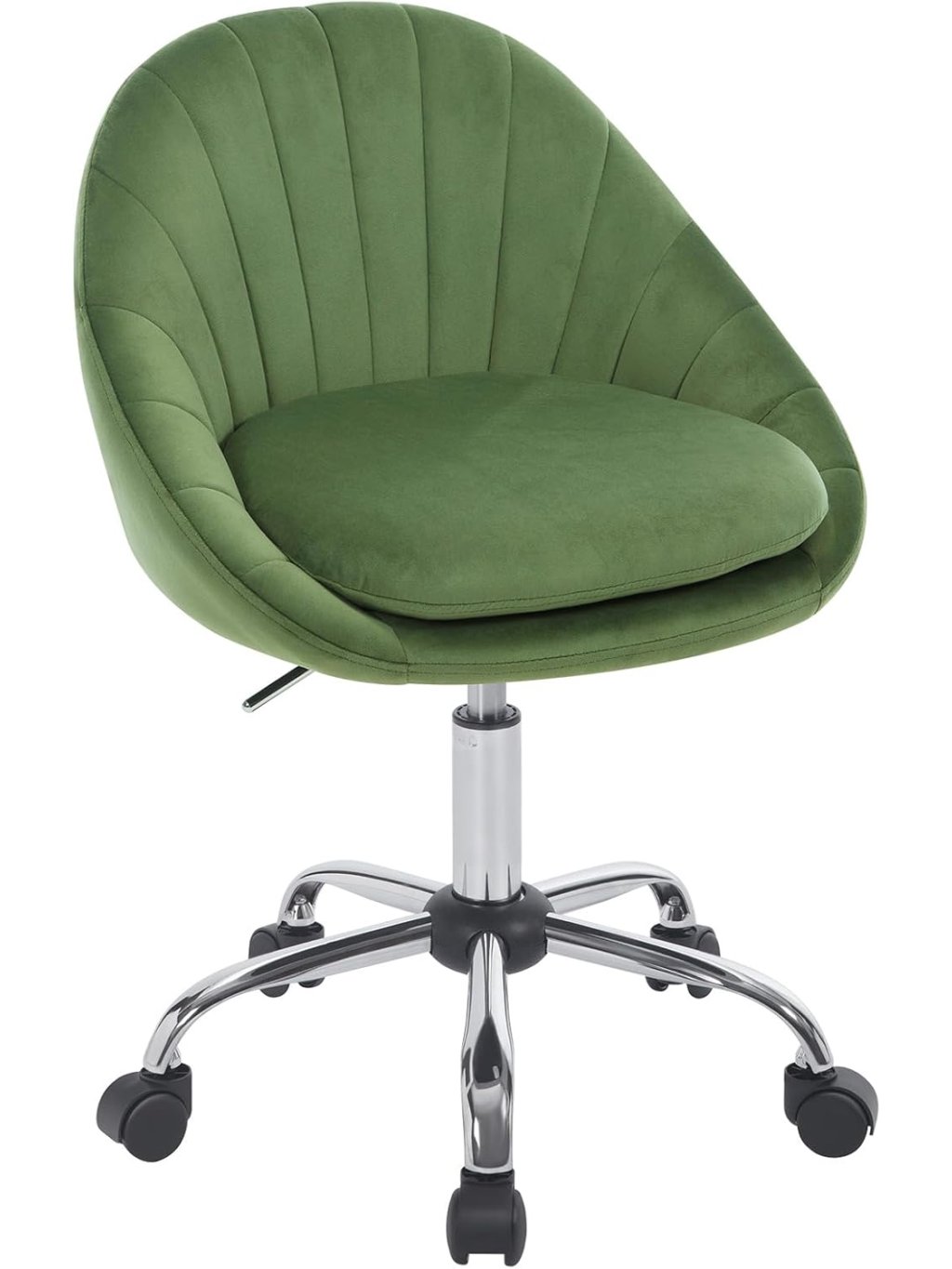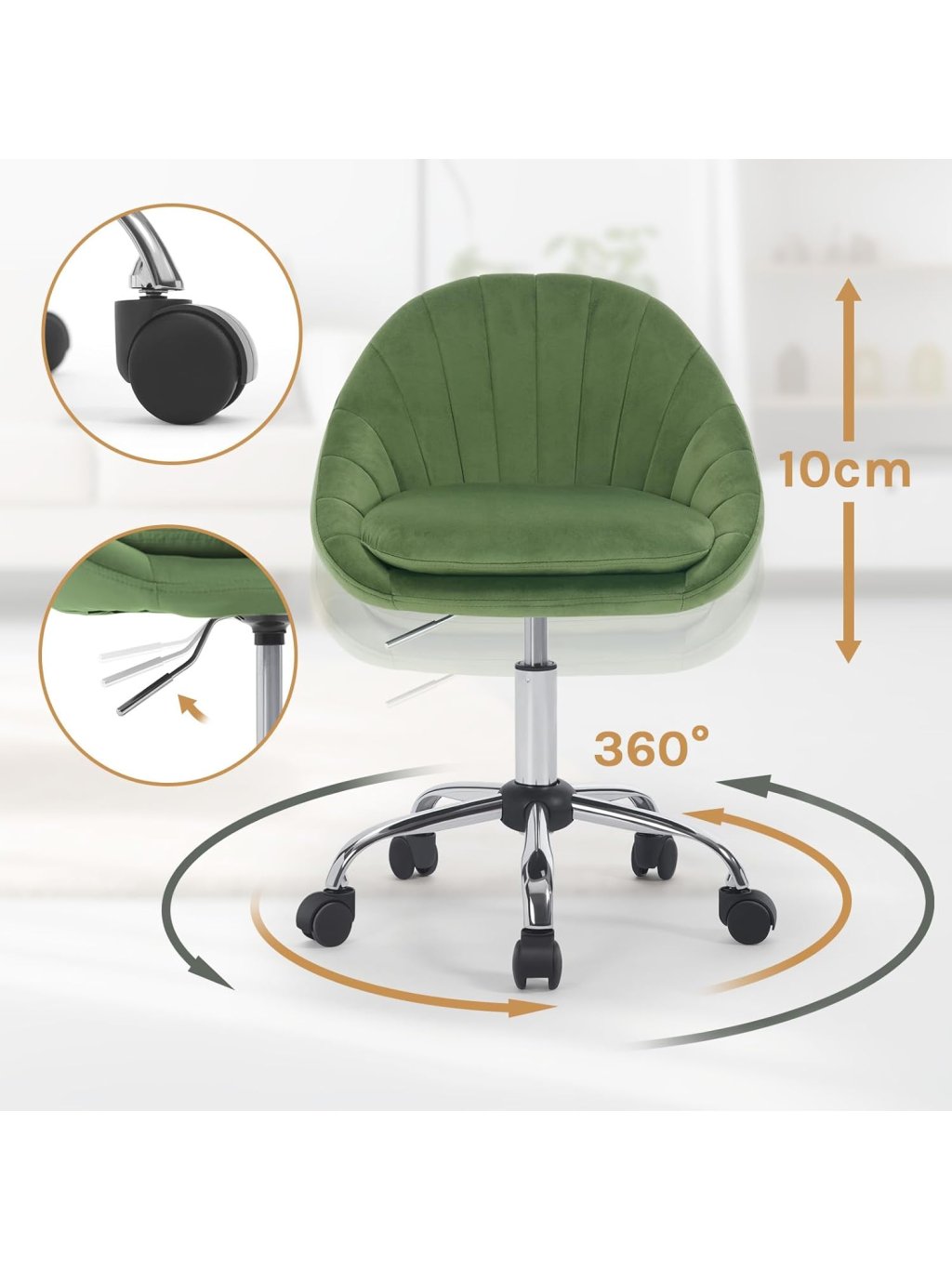 Tato kancelářská židle kombinuje luxusní vzhled s moderním ergonomickým designem. Unikátní prošívané opěradlo ve tvaru mušle dodá vašemu interiéru nádech elegance, ať už židli umístíte do domácí pracovny, k toaletnímu stolku v ložnici nebo do reprezentativního salonu.