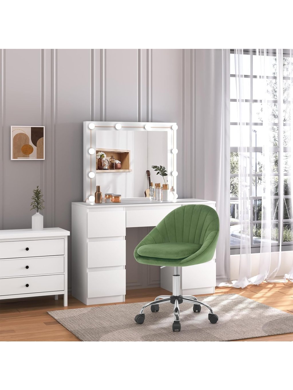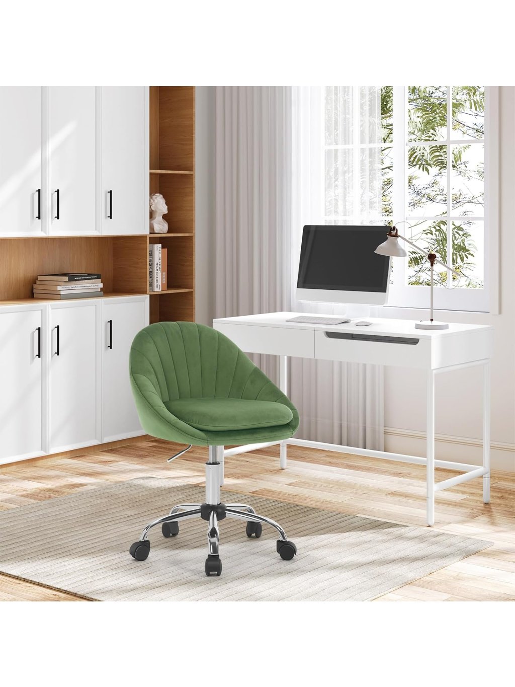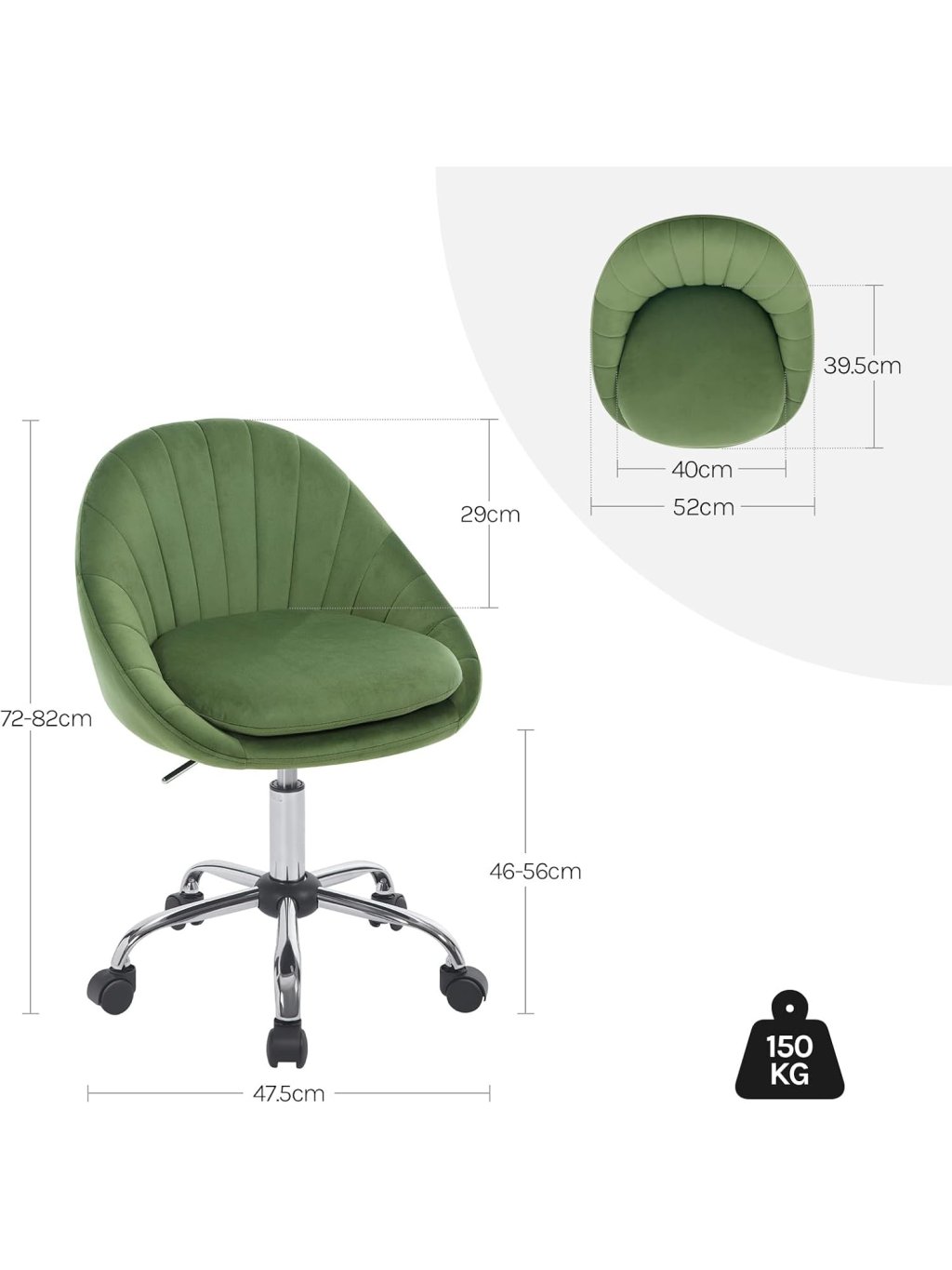 Tato kancelářská židle kombinuje luxusní vzhled s moderním ergonomickým designem. Unikátní prošívané opěradlo ve tvaru mušle dodá vašemu interiéru nádech elegance, ať už židli umístíte do domácí pracovny, k toaletnímu stolku v ložnici nebo do reprezentativního salonu.