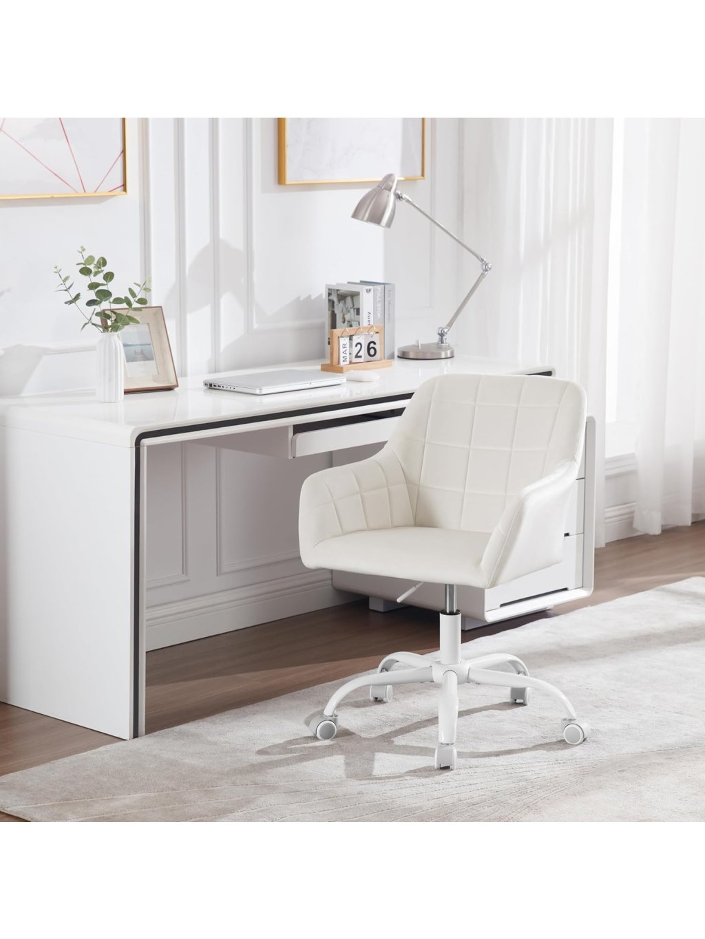 Toto designové kancelářské křeslo v krémově bílém odstínu přináší do vašeho pracovního prostoru, ložnice nebo k toaletnímu stolku nádech moderní elegance a světla. Výrazným prvkem tohoto modelu je unikátní svislé vlnité prošívání, které židli dodává jedinečný vizuální charakter a texturu připomínající mořskou mušli.