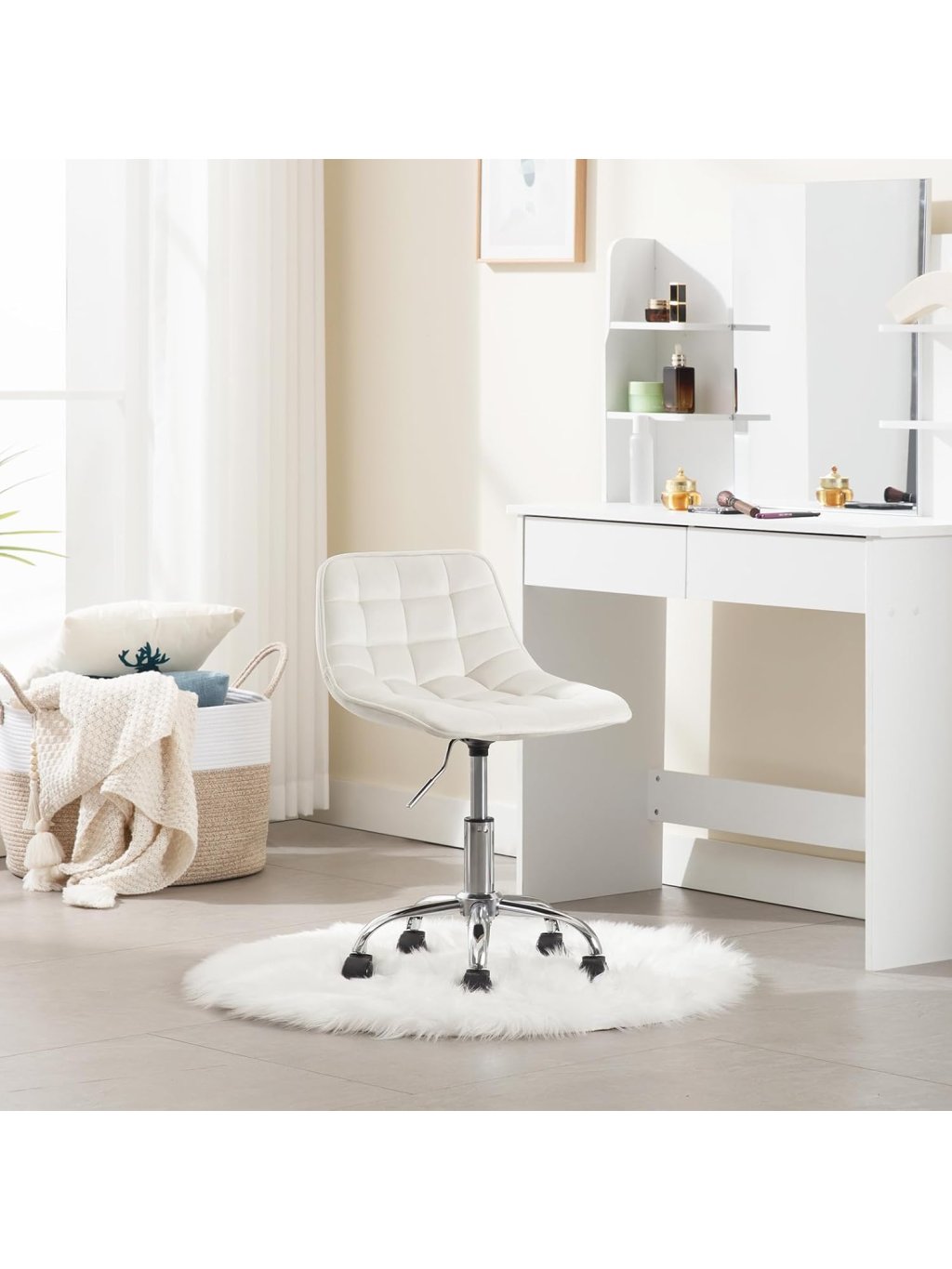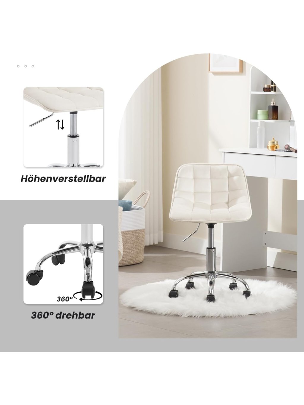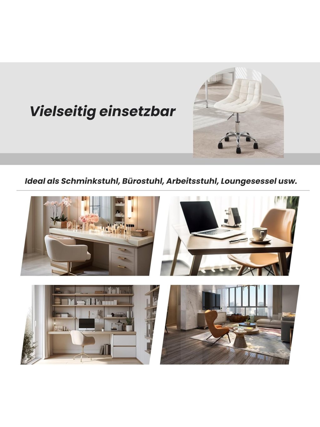 Praktické a multifunkční využití: Kompaktní rozměry a moderní vzhled umožňují použití jako dětská židle k psacímu stolu, kosmetická židle, otočná kancelářská židle, pracovní stolička apod. Hodí se do dětského pokoje, ložnice, pracovny, k toaletnímu stolku nebo i do salonu.