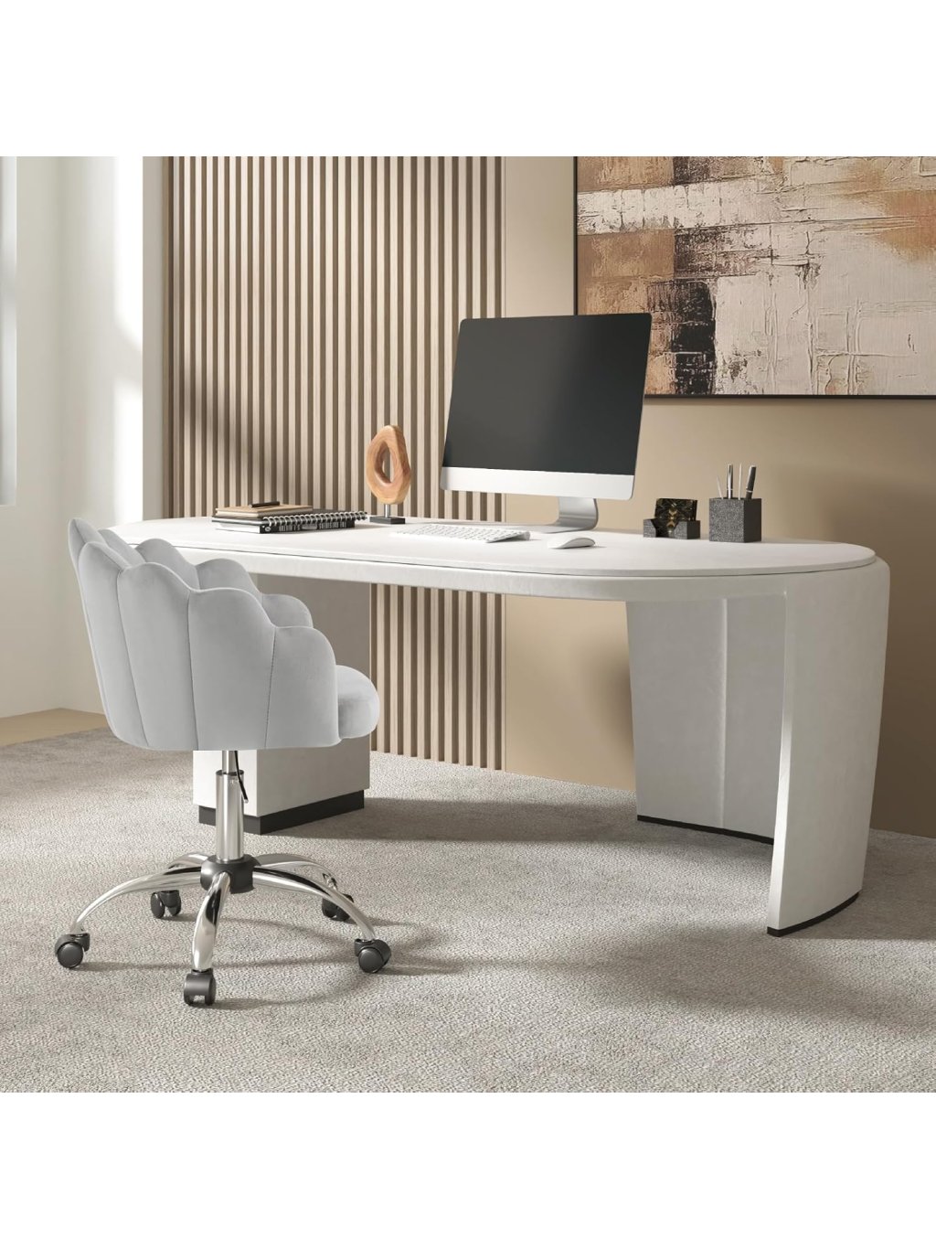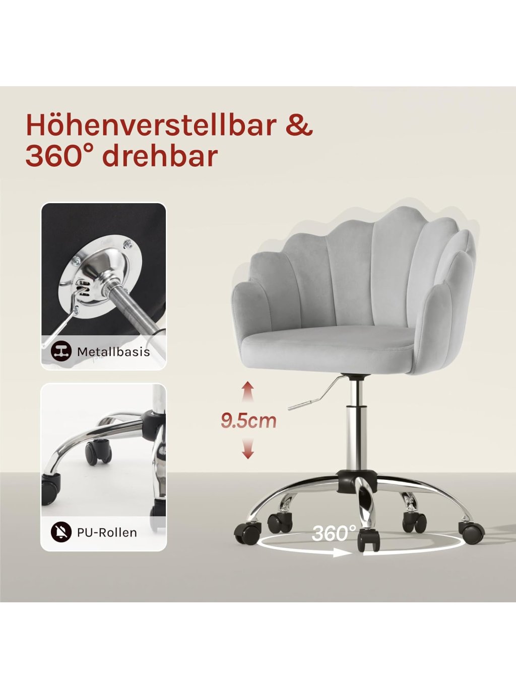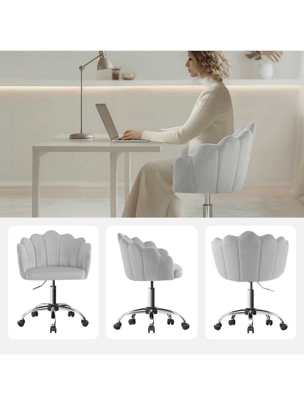 Otočná židle ve tvaru květu – světle šedá sametová kancelářská židle s kolečky