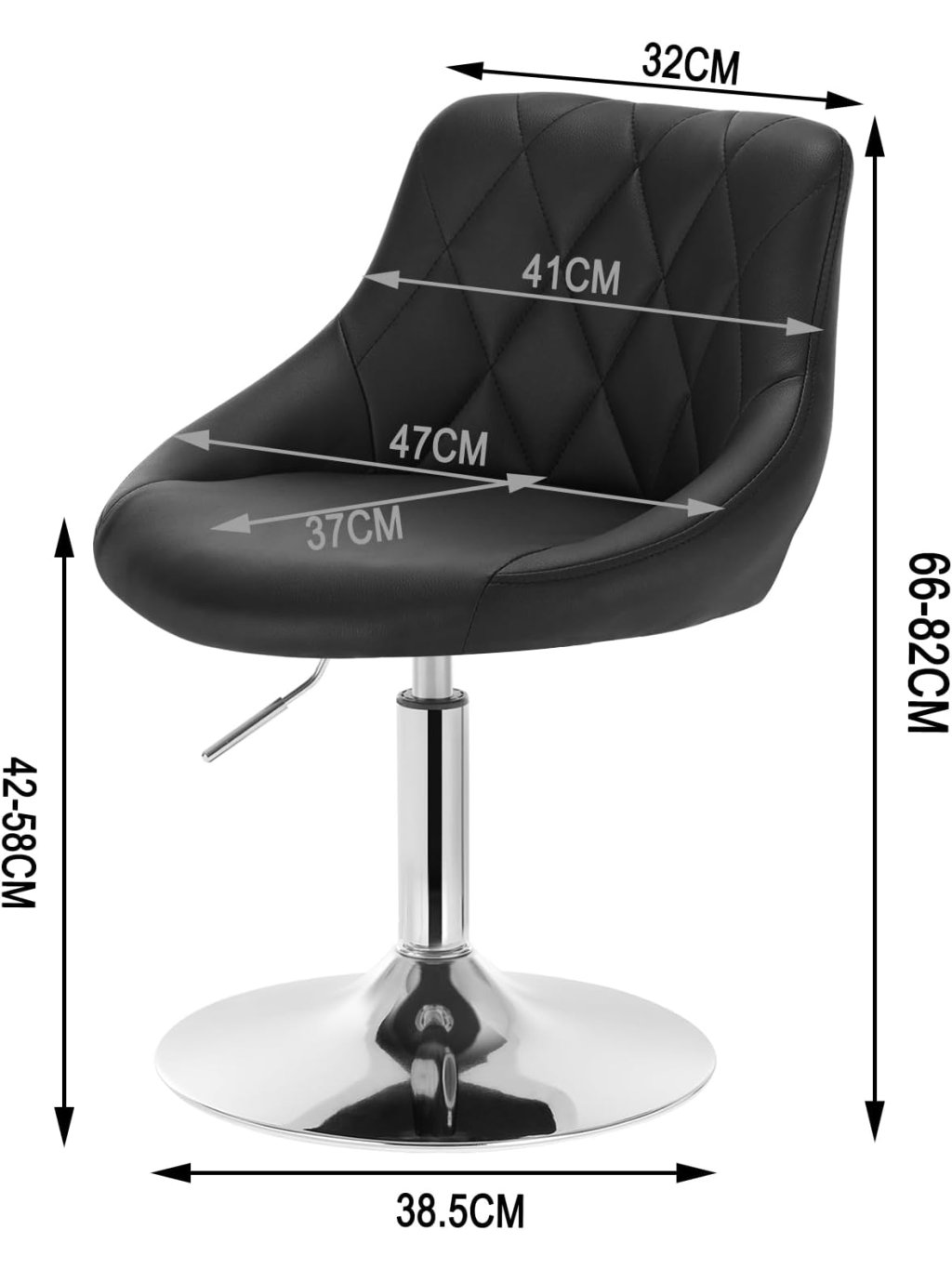 Stabilní kovová konstrukce s chromovanou povrchovou úpravou zaručuje dlouhou životnost a bezpečné používání. Plynový píst umožňuje plynulé nastavení výšky sedu v rozmezí 42–58 cm a otočný mechanismus nabízí plnou rotaci o 360°. Gumový protiskluzový kroužek na spodní straně základny chrání podlahu před poškrábáním a snižuje hluk při pohybu.