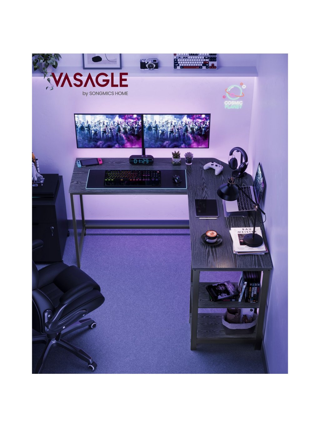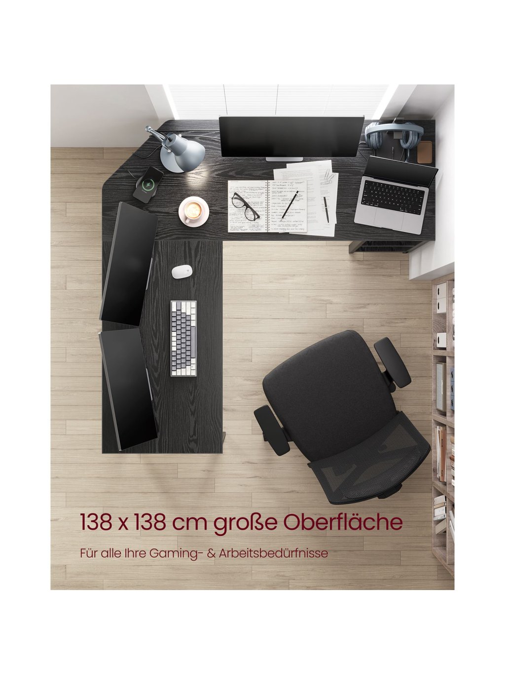 S rozměry 138 × 138 cm nabízí tento rohový stůl dostatek místa pro 3 až 4 monitory, práci i hraní her. Vše důležité máte pohodlně na dosah.