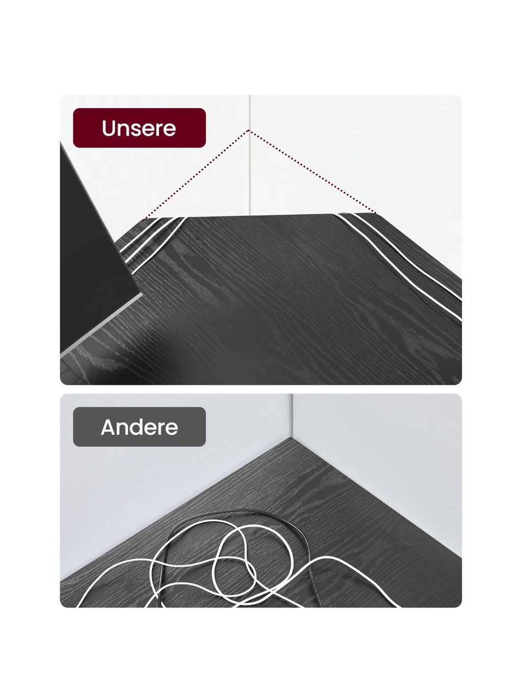 Zkosený roh stolu umožňuje elegantní vedení kabelů od elektroniky a pomáhá udržet pracovní plochu uklizenou a přehlednou.