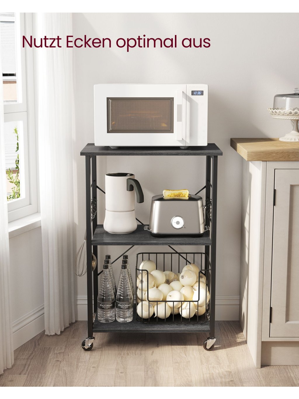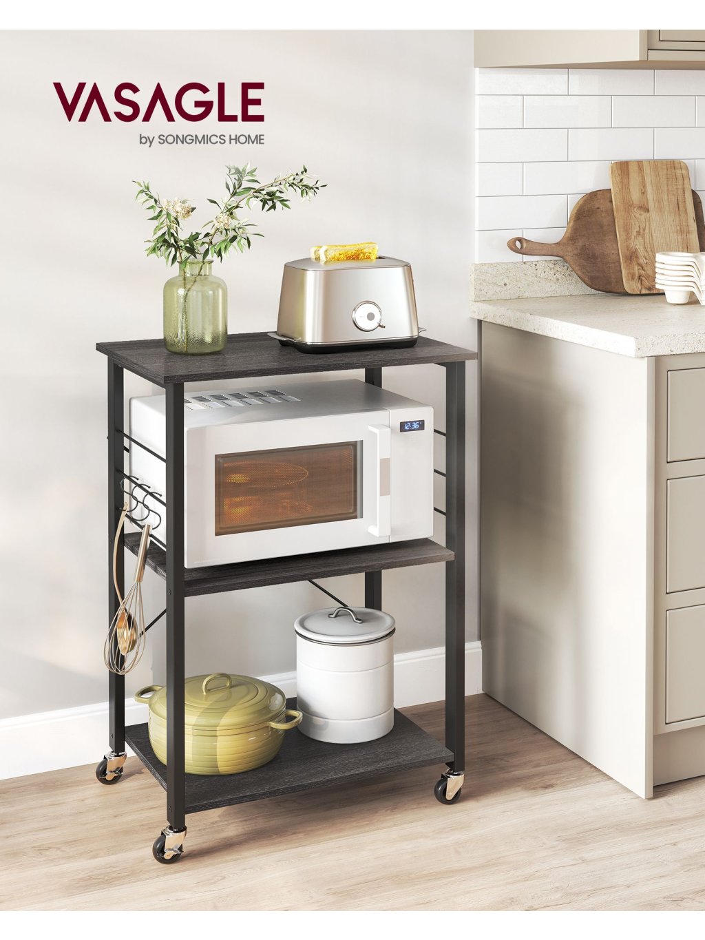 Máte malou kuchyň a bojujete s místem? Tento třípatrový kuchyňský regál vám pomůže. Díky kompaktním rozměrům 60 × 40 × 89 cm a rozestupem polic 38 cm získáte spoustu místa pro mikrovlnku, spotřebiče či potraviny.