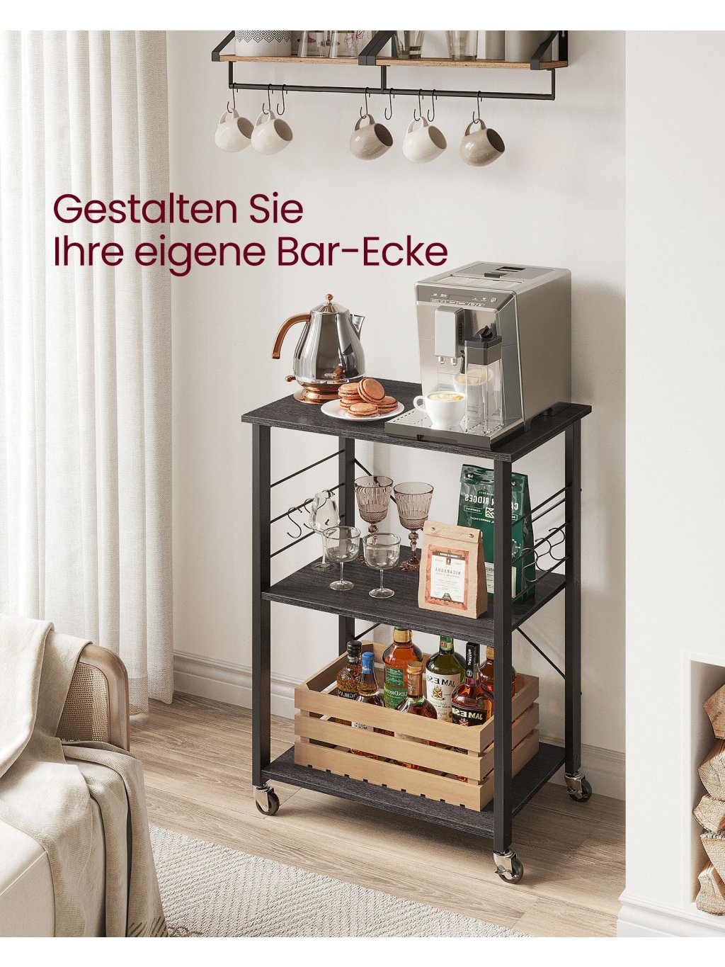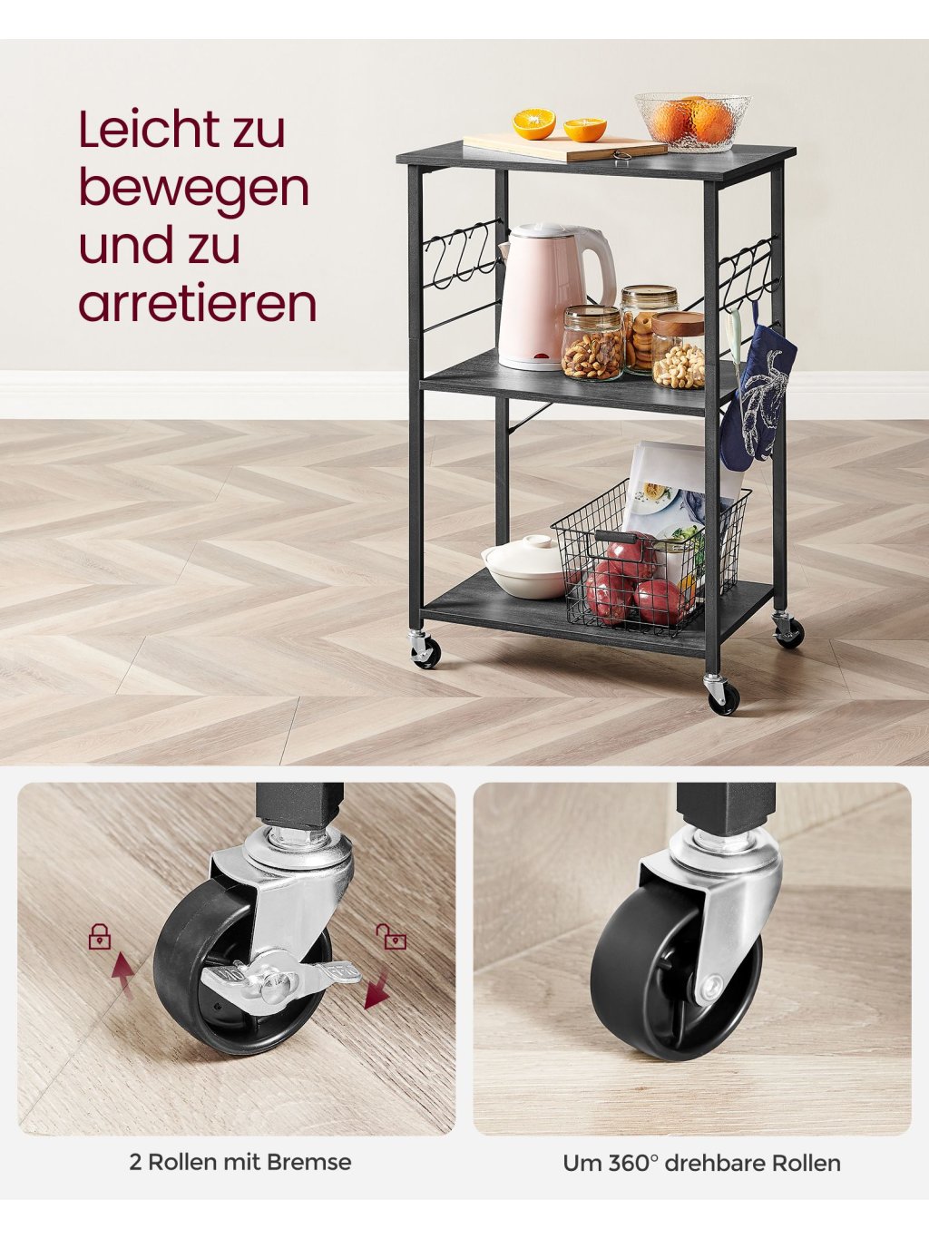Vozík je vybaven 4 kolečky, z toho 2 s brzdou, takže ho snadno přesunete kamkoliv – z kuchyně do jídelny nebo obýváku. Ideální pro podávání občerstvení hostům.