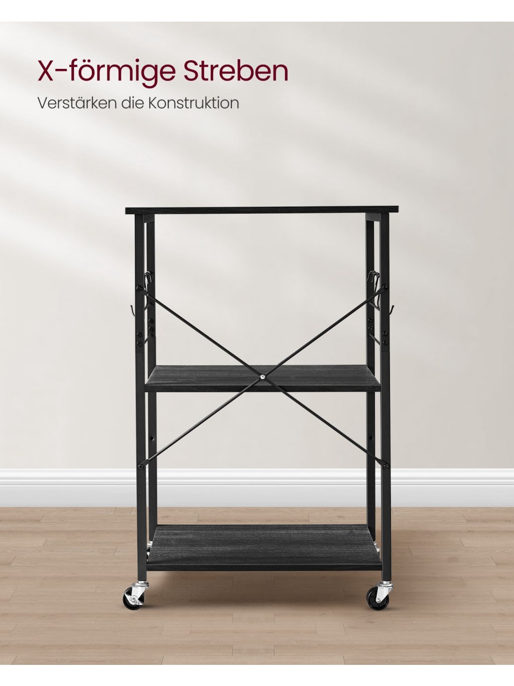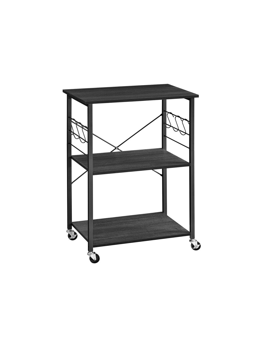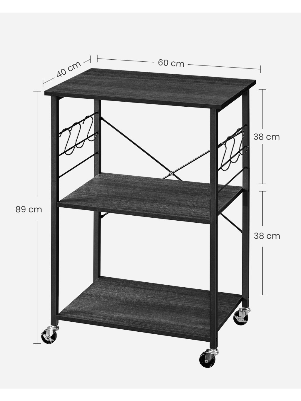 Kuchyňský vozík se 3 policemi, 6 háčky a kolečky – ebenový dub/černý, 60 × 40 × 89 cm