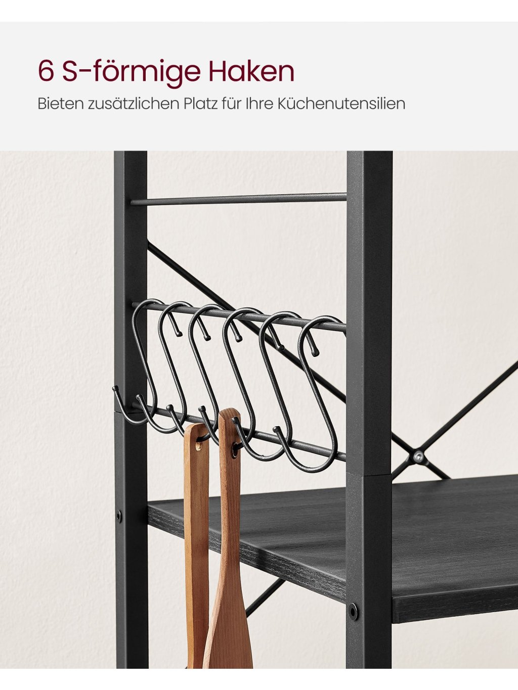 Součástí balení je 6 odnímatelných háčků ve tvaru S – ideální na kuchyňské náčiní, chňapky nebo utěrky. Vše máte vždy po ruce.