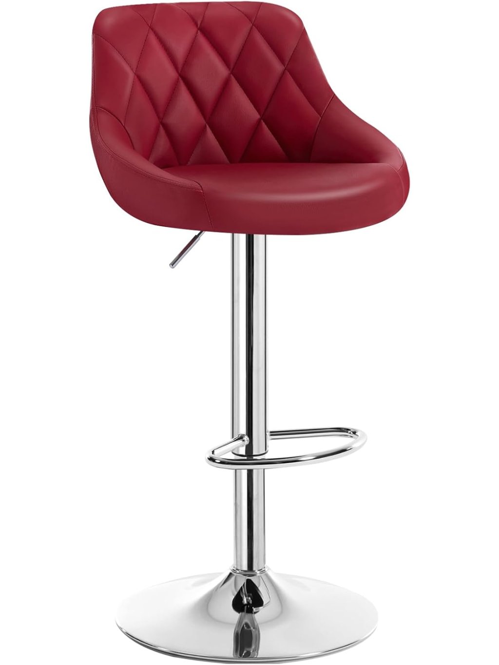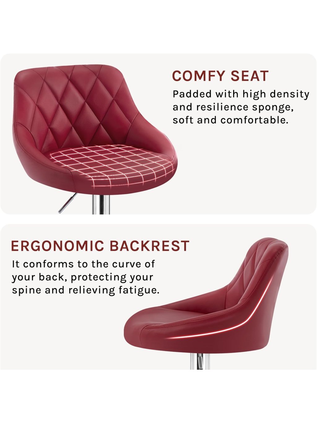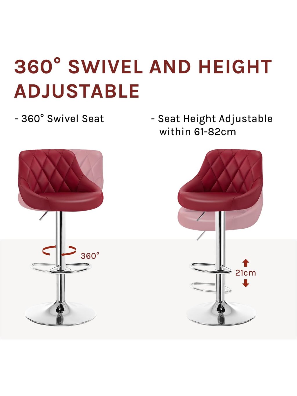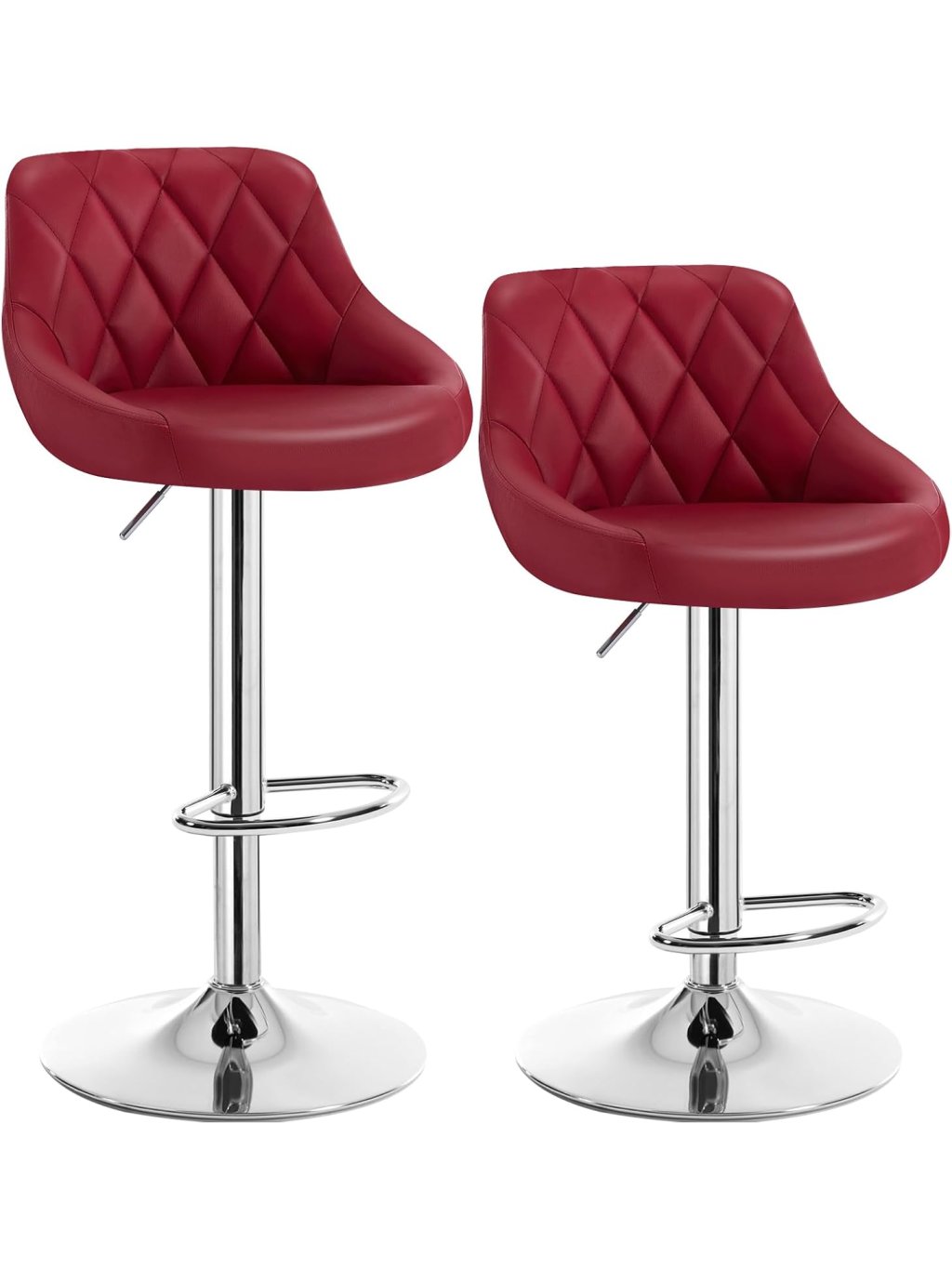 Sada 2 barových židlí s opěrkou zad, výškově nastavitelné a otočné 360°, koženka, vínově červené