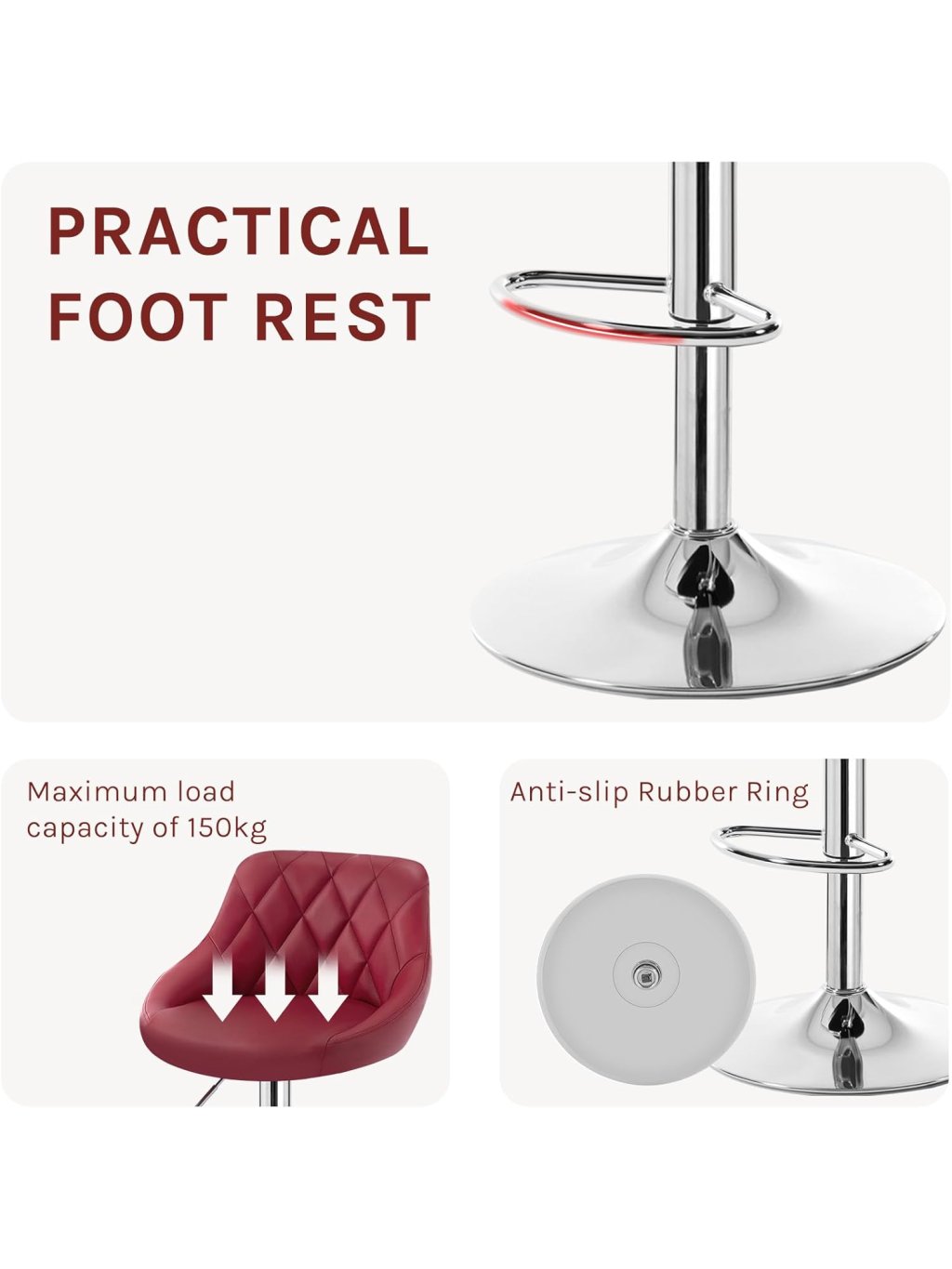 Stabilitu a bezpečnost zajišťuje robustní chromovaná kovová konstrukce s širokou kulatou základnou. Protiskluzový kroužek na spodní straně základny chrání podlahu před poškrábáním, zabraňuje klouzání a tlumí hluk při otáčení či pohybu.