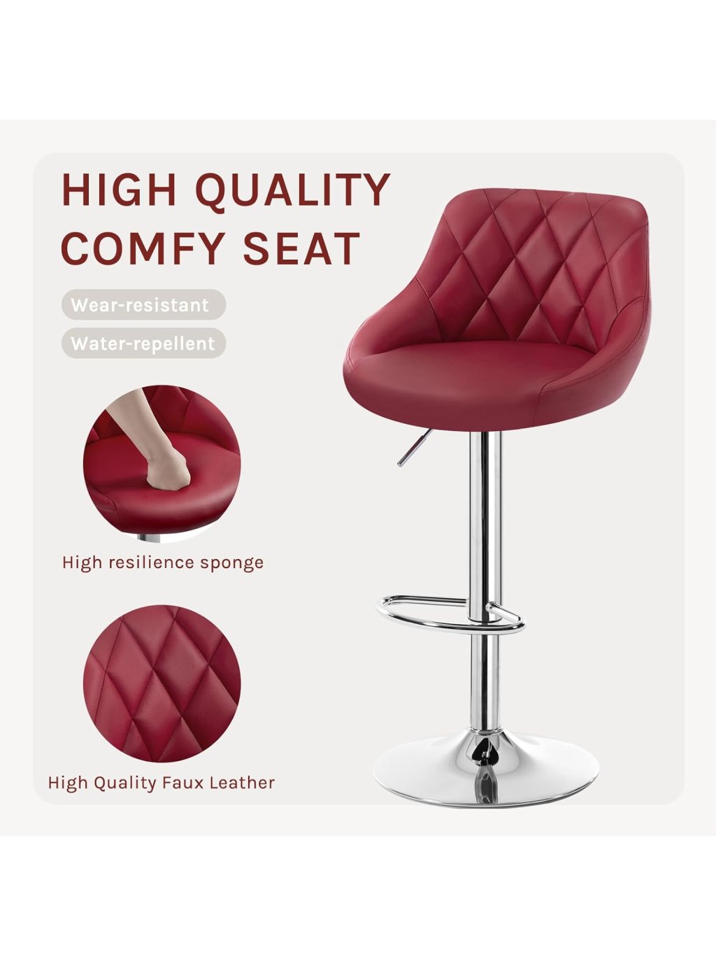 Tato sada dvou barových židlí nabízí kombinaci moderního designu, pohodlí a vysoké funkčnosti. Sedák s opěrkou zad je potažen kvalitní umělou kůží, která je příjemná na dotek, snadná na údržbu a vhodná pro každodenní používání. Výplň z husté elastické pěny poskytuje komfortní sezení a pomáhá ulevit zádům i nohám.
