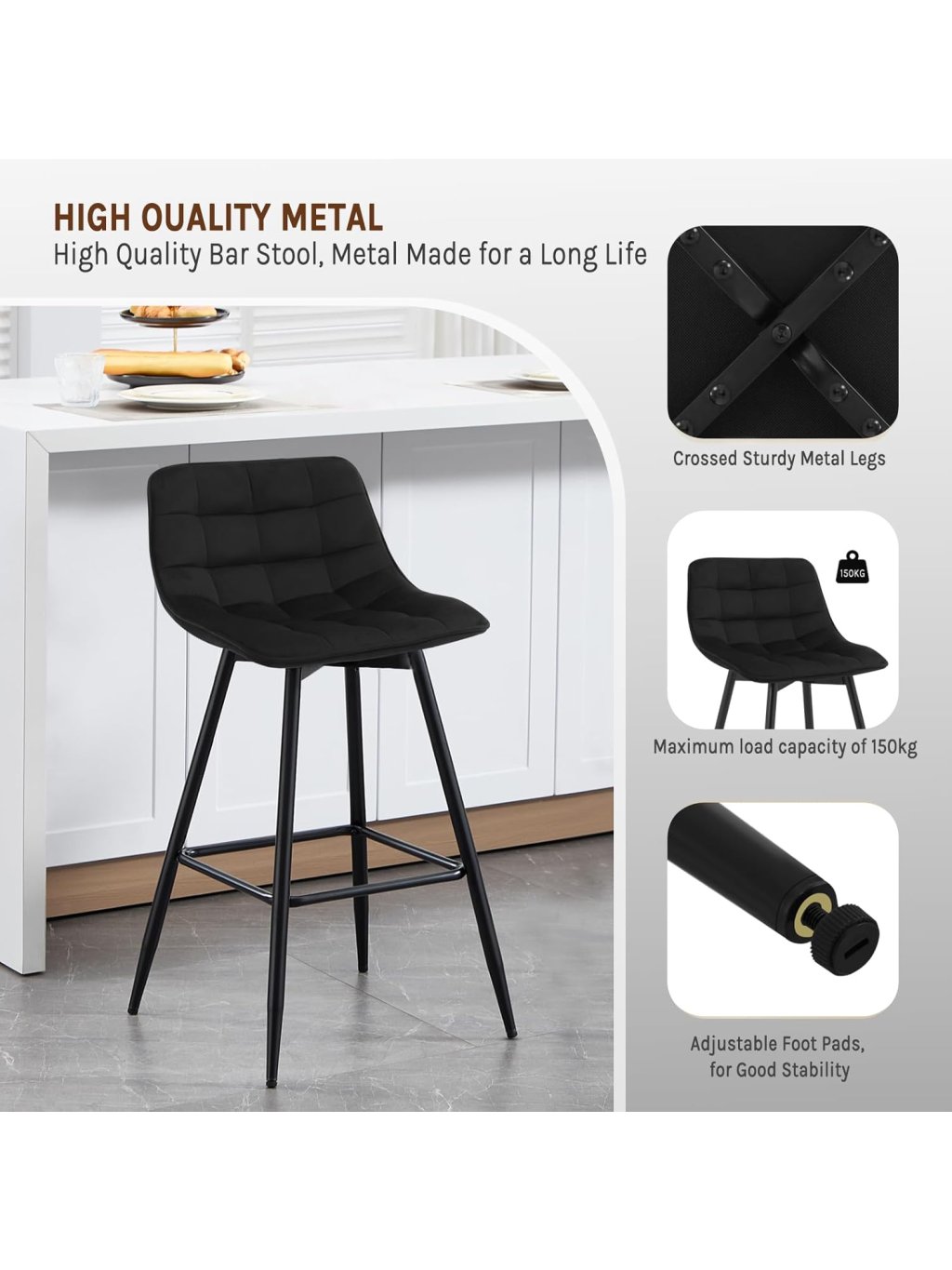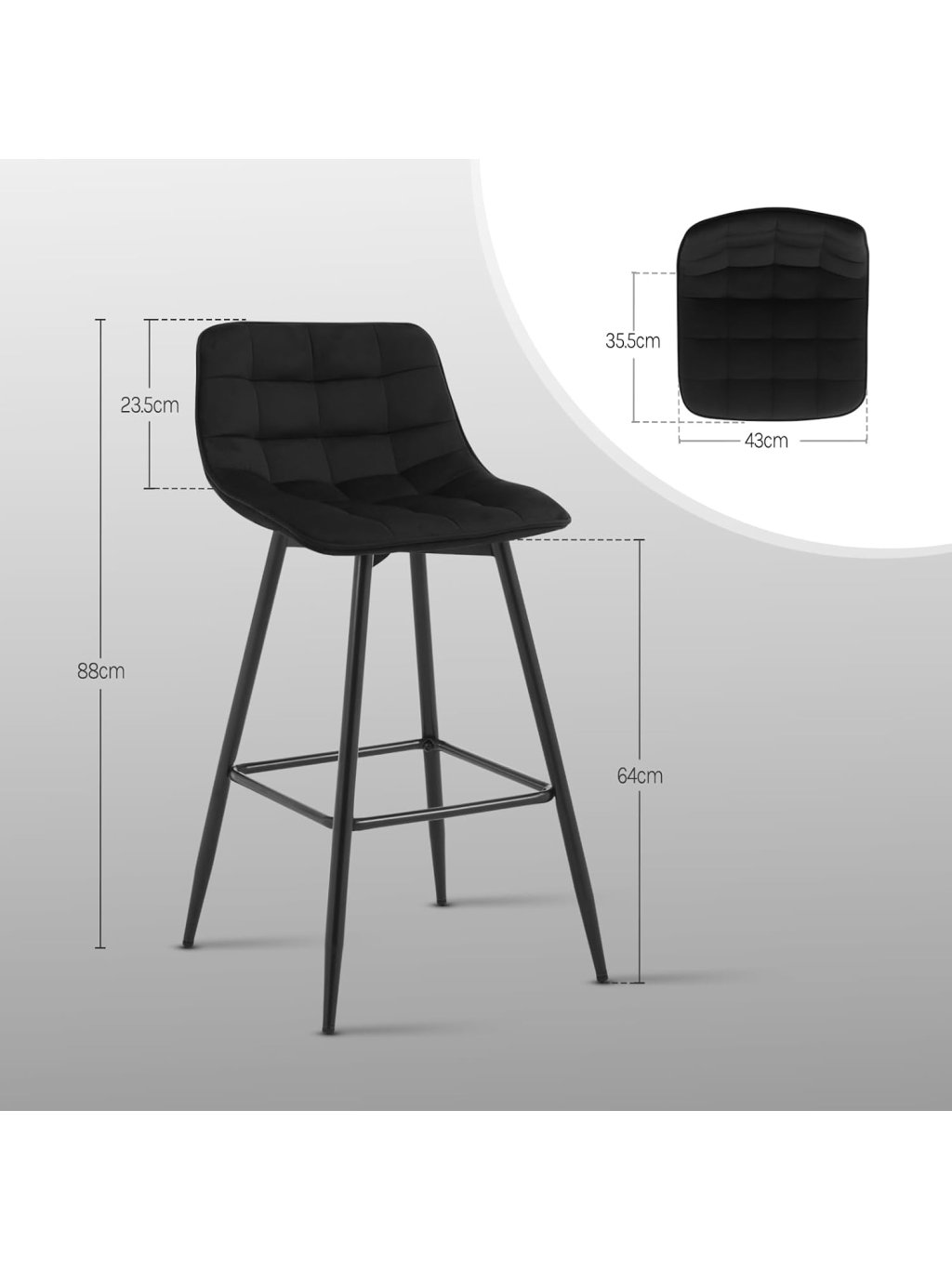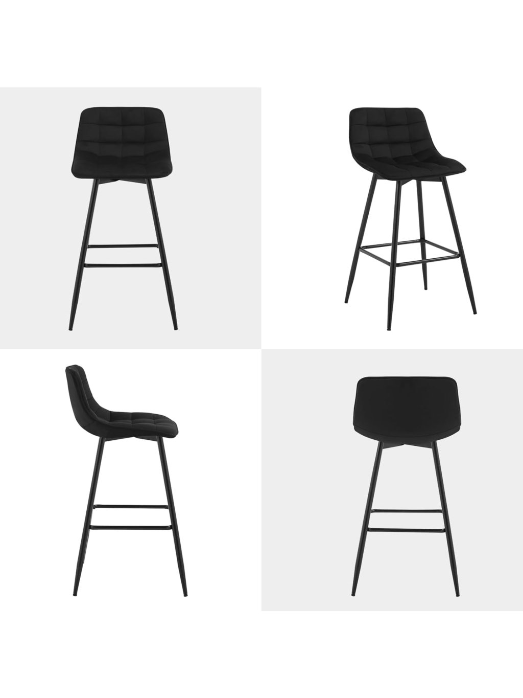 Tato sada dvou barových židlí nabízí elegantní vzhled, pohodlné sezení a stabilní konstrukci vhodnou pro každodenní použití. Sametový sedák je příjemný na dotek, tvarově stálý a odolný, přičemž výplň z husté pěny zajišťuje komfort i při delším sezení.