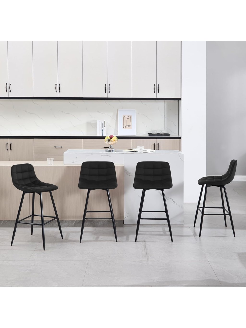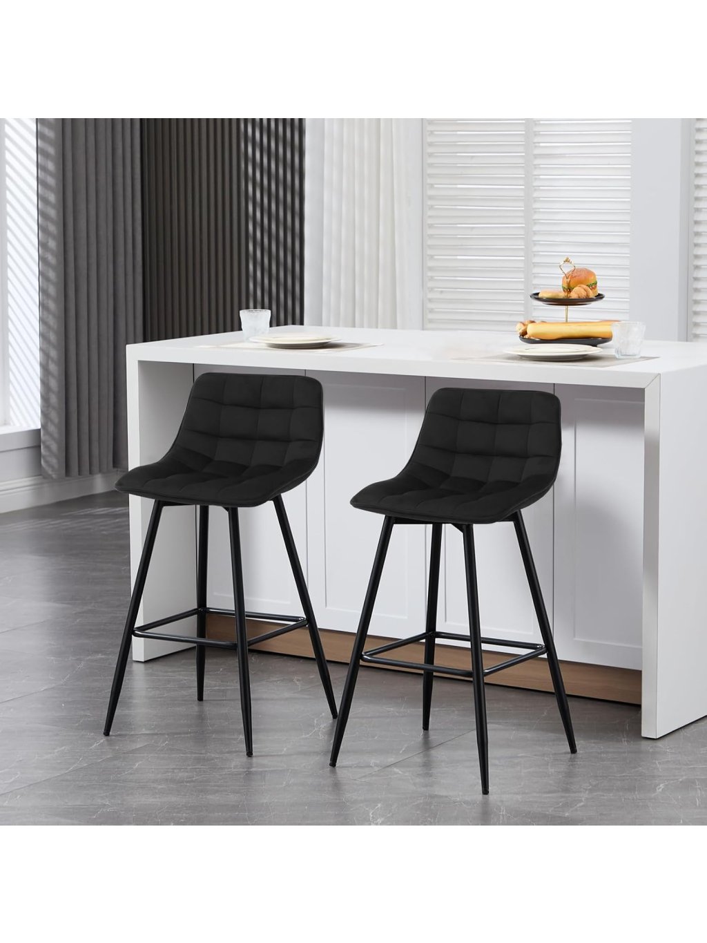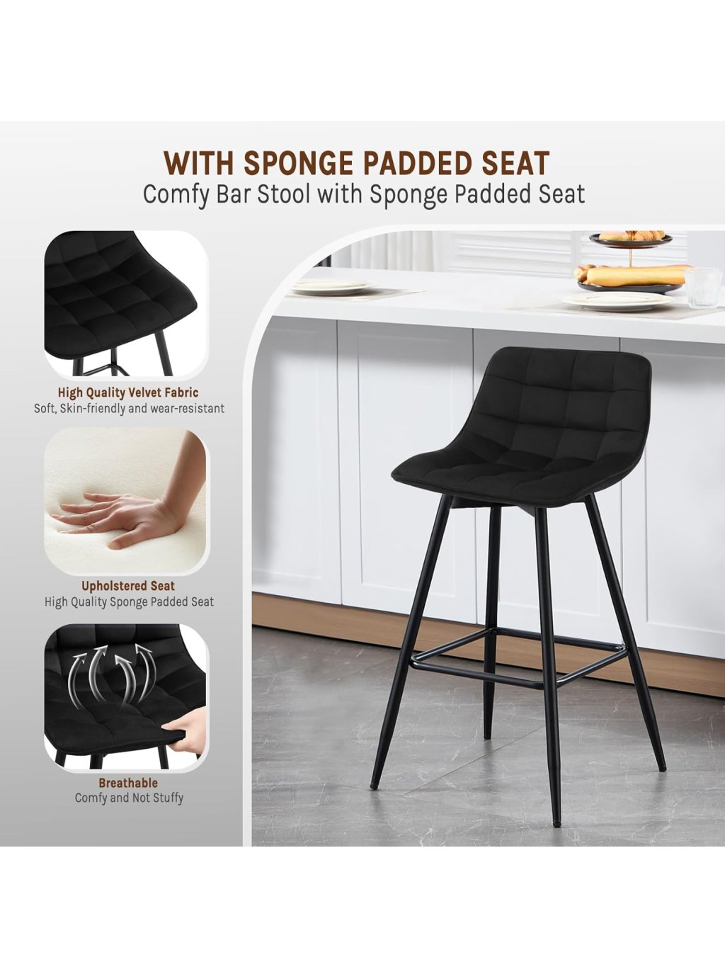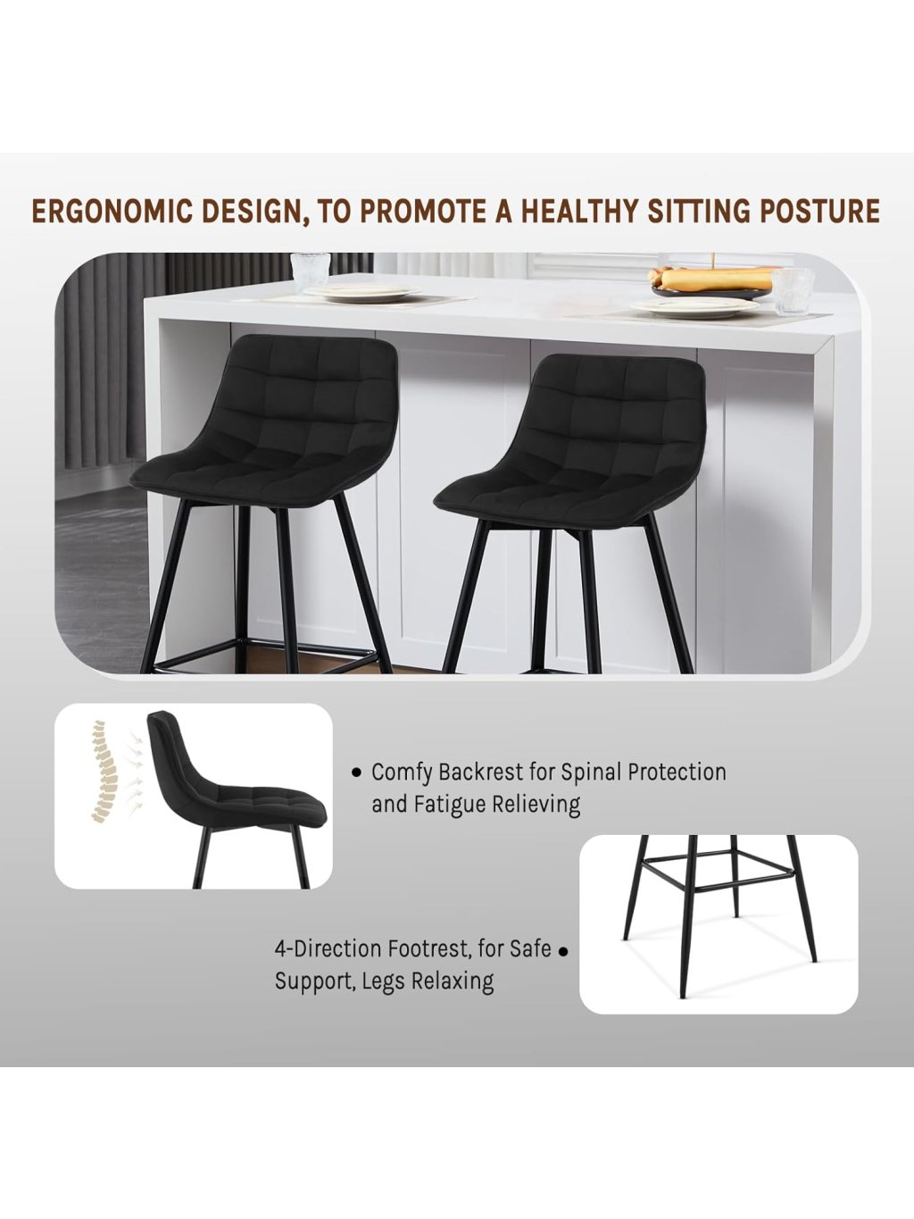 Tato sada dvou barových židlí nabízí elegantní vzhled, pohodlné sezení a stabilní konstrukci vhodnou pro každodenní použití. Sametový sedák je příjemný na dotek, tvarově stálý a odolný, přičemž výplň z husté pěny zajišťuje komfort i při delším sezení.