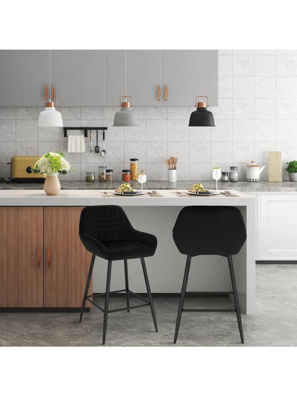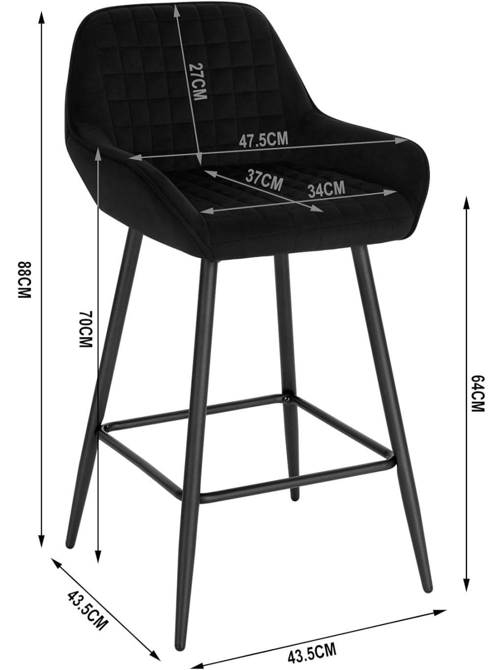 Tato sada dvou designových barových židlí spojuje moderní vzhled, vysoký komfort sezení a pevnou konstrukci. Díky kombinaci sametového potahu a kovového rámu se židle snadno stanou elegantním doplňkem kuchyně, domácího baru nebo kuchyňského ostrůvku.