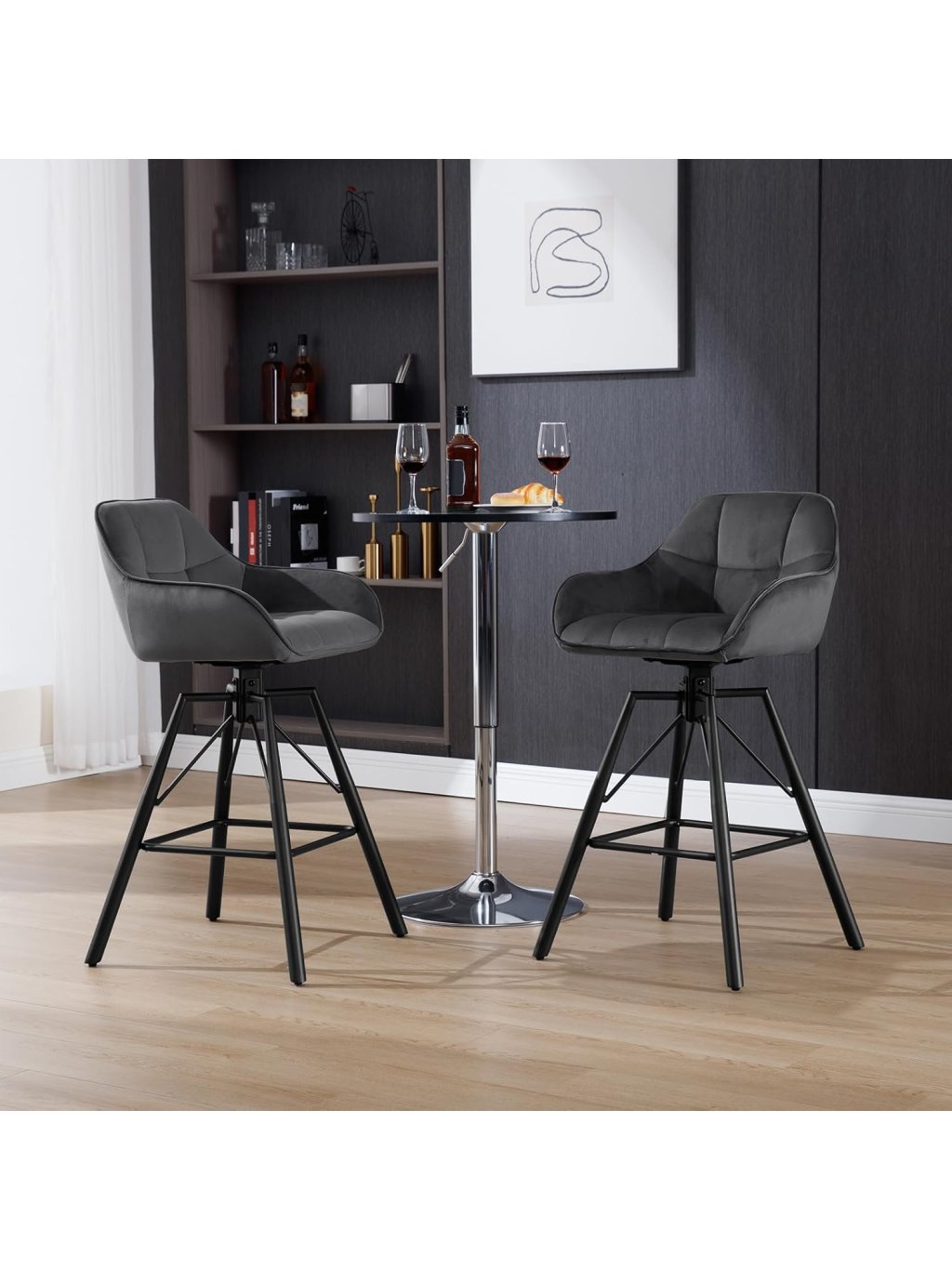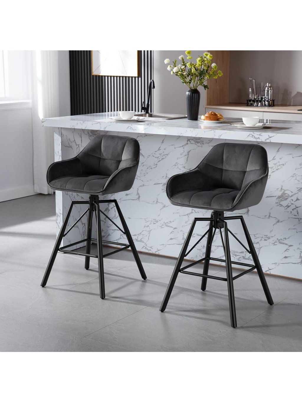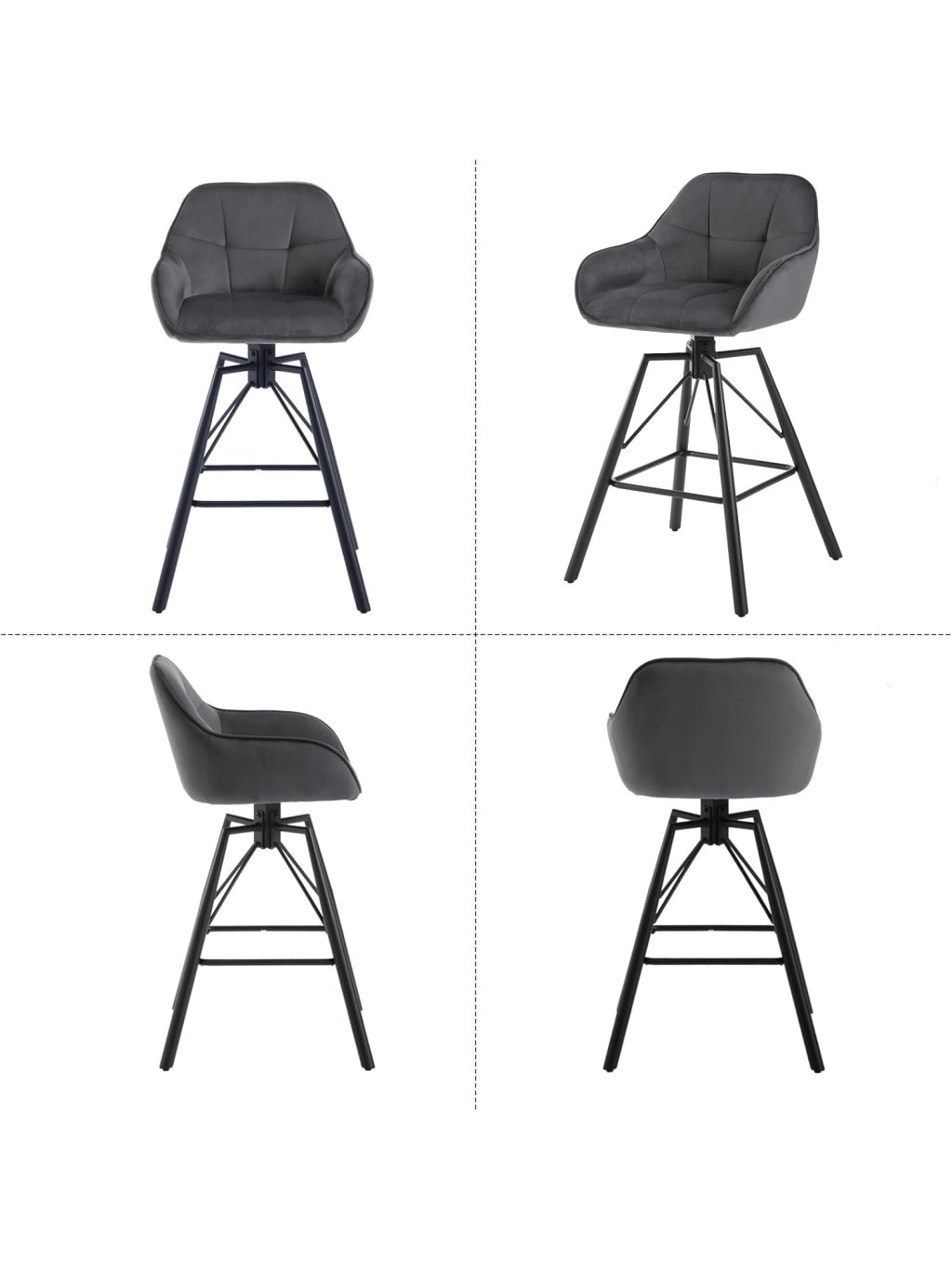 Tato sada dvou barových židlí v elegantním antracitovém odstínu představuje dokonalou rovnováhu mezi moderním designem a výjimečným pohodlím. Díky kombinaci luxusního sametu a černé kovové základny se židle stanou stylovým doplňkem vaší kuchyně, domácího baru nebo moderního interiéru.