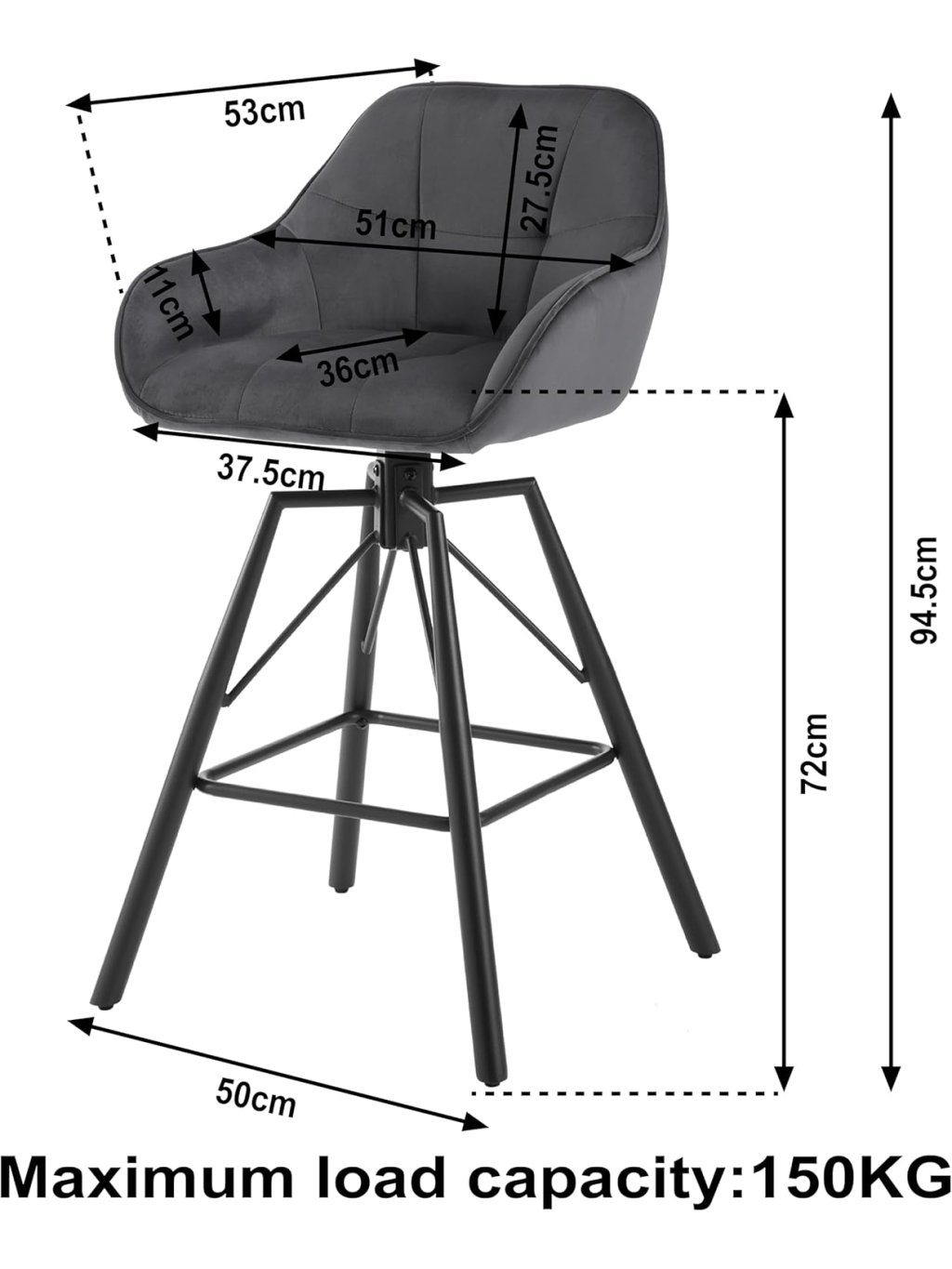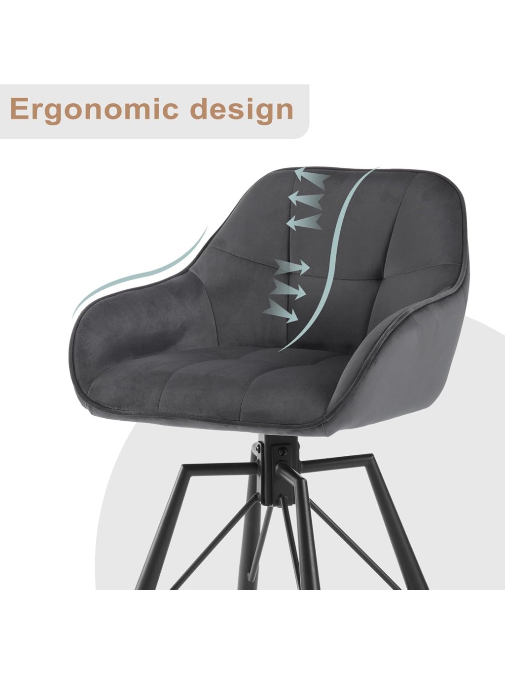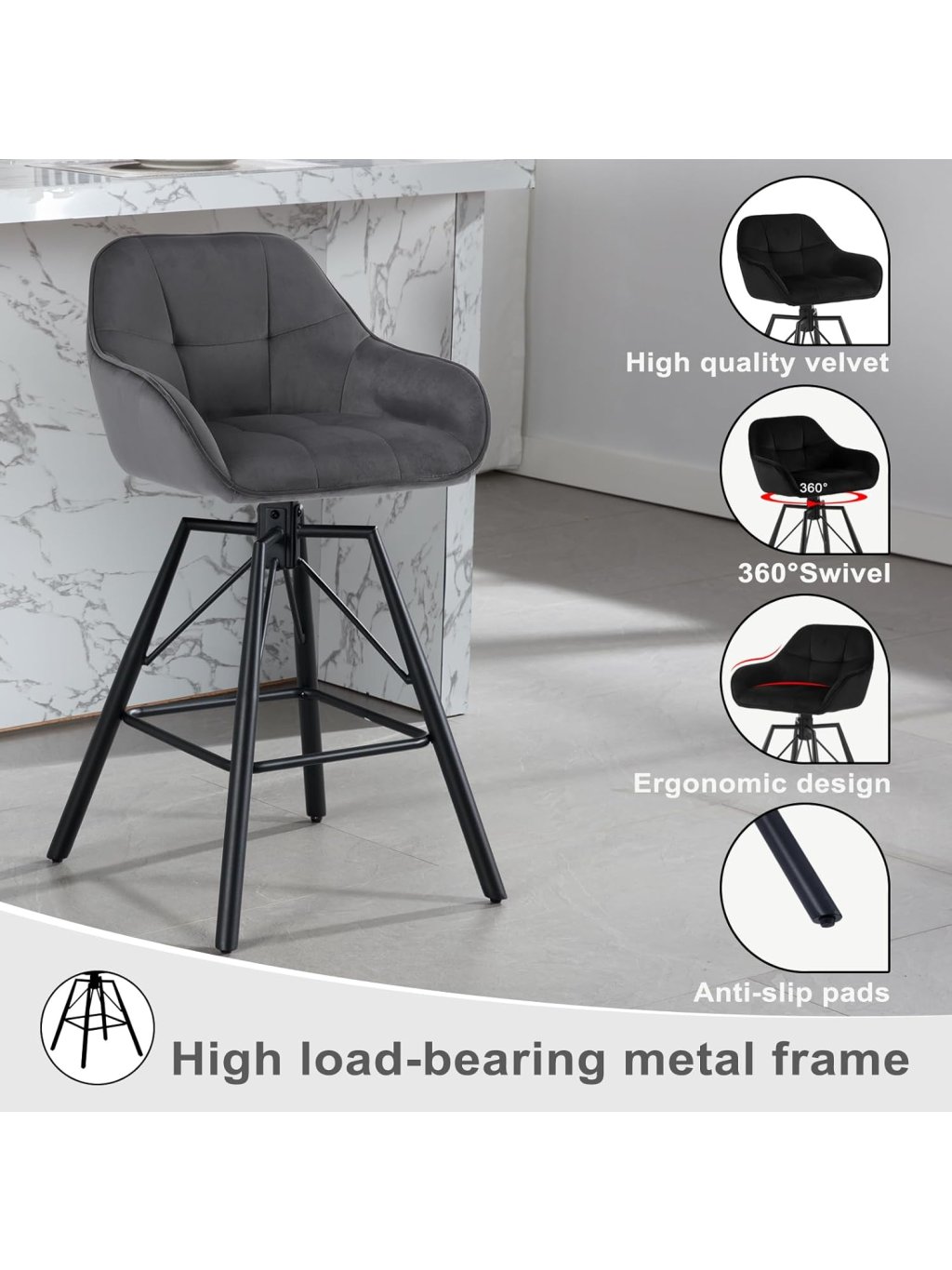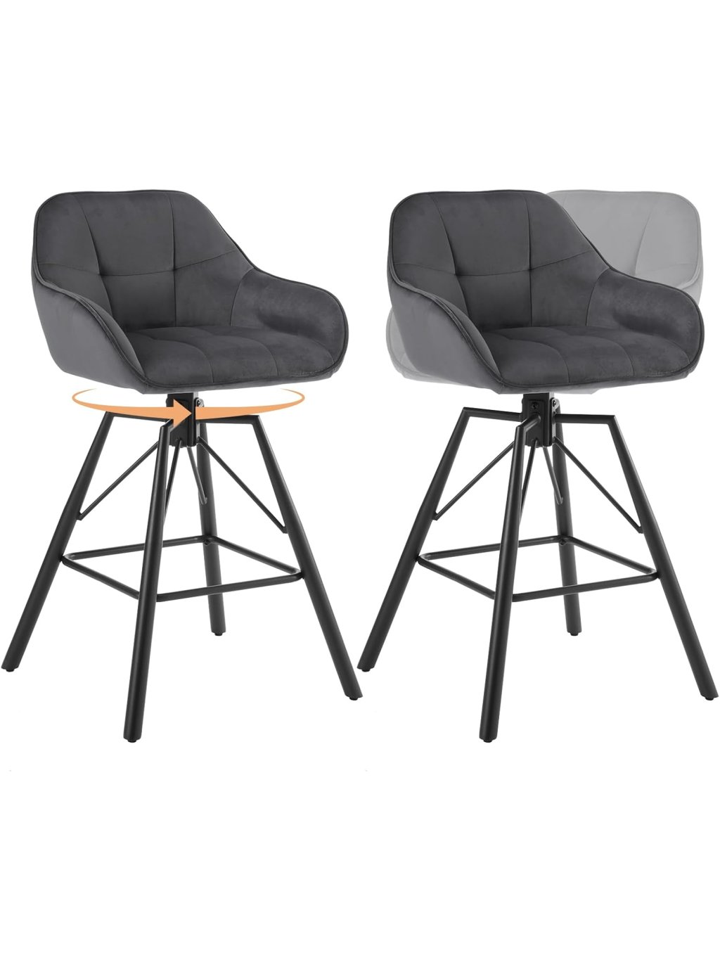 Tato sada dvou barových židlí v elegantním antracitovém odstínu představuje dokonalou rovnováhu mezi moderním designem a výjimečným pohodlím. Díky kombinaci luxusního sametu a černé kovové základny se židle stanou stylovým doplňkem vaší kuchyně, domácího baru nebo moderního interiéru.