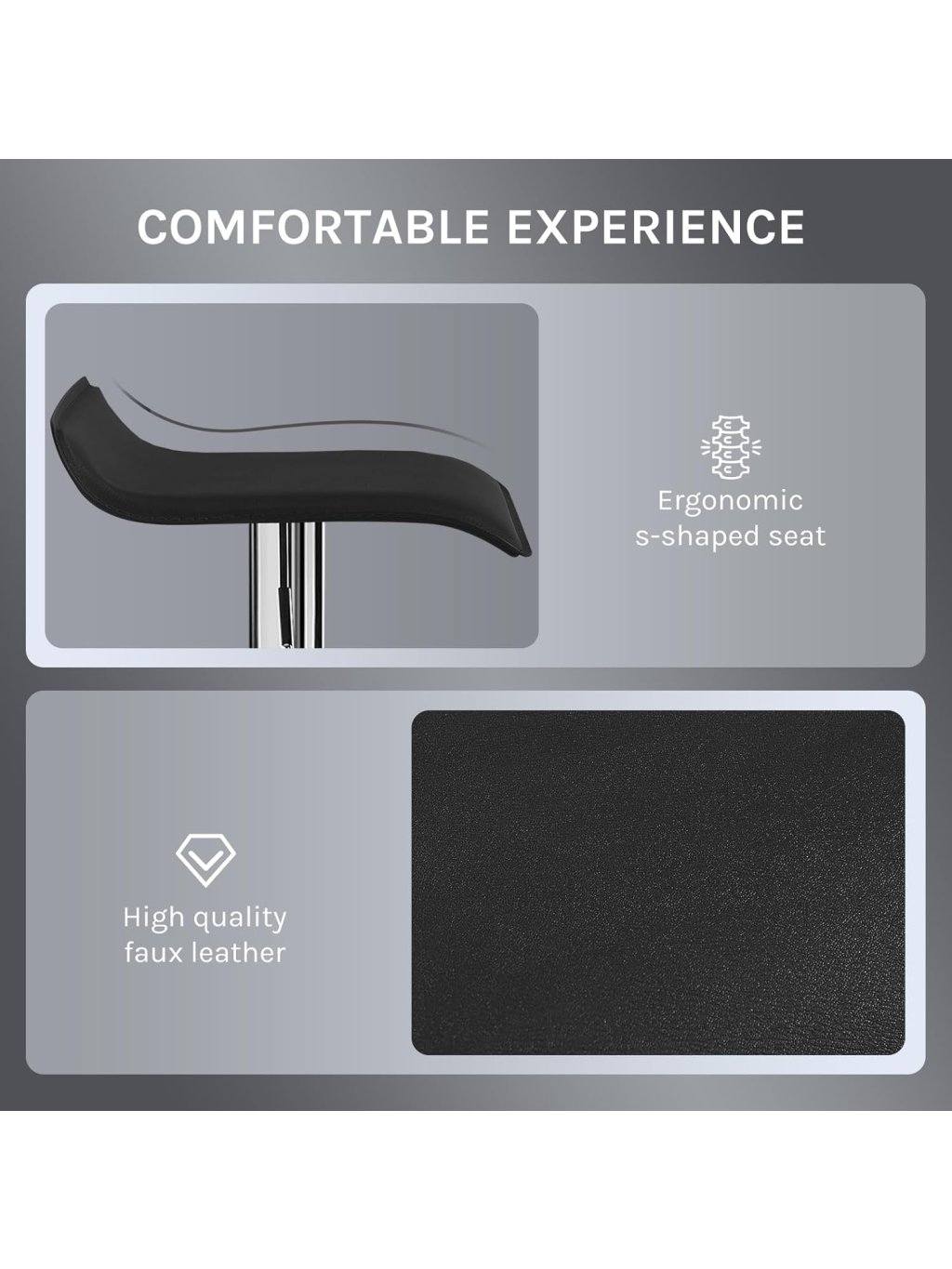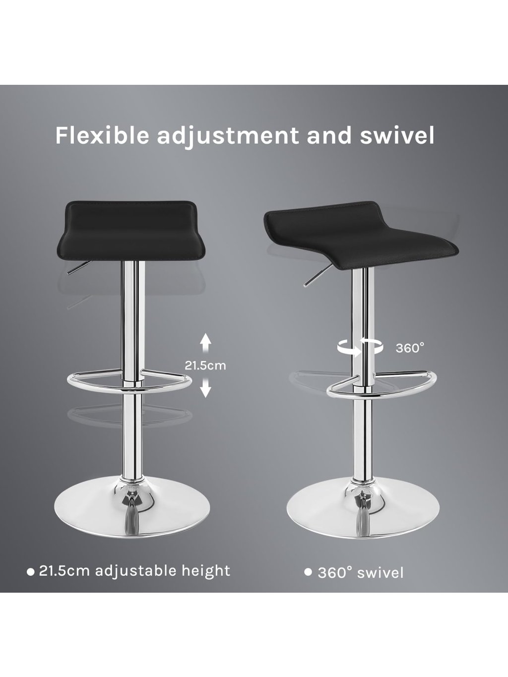 Univerzální použití: Díky modernímu vzhledu se hodí do kuchyně, k jídelnímu pultu, do baru, kavárny nebo pracovny. Výškově nastavitelný mechanismus a 360° otočný sedák poskytují flexibilitu pro každou příležitost.