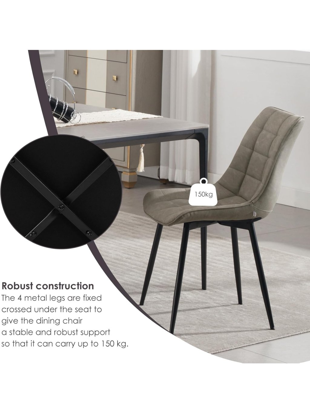 Stabilitu a dlouhou životnost zajišťují pevné kovové nohy. Každá židle má nosnost až 150 kg, což zaručuje bezpečné a spolehlivé používání. Moderní a jednoduchý vzhled umožňuje snadné začlenění do různých typů interiérů.