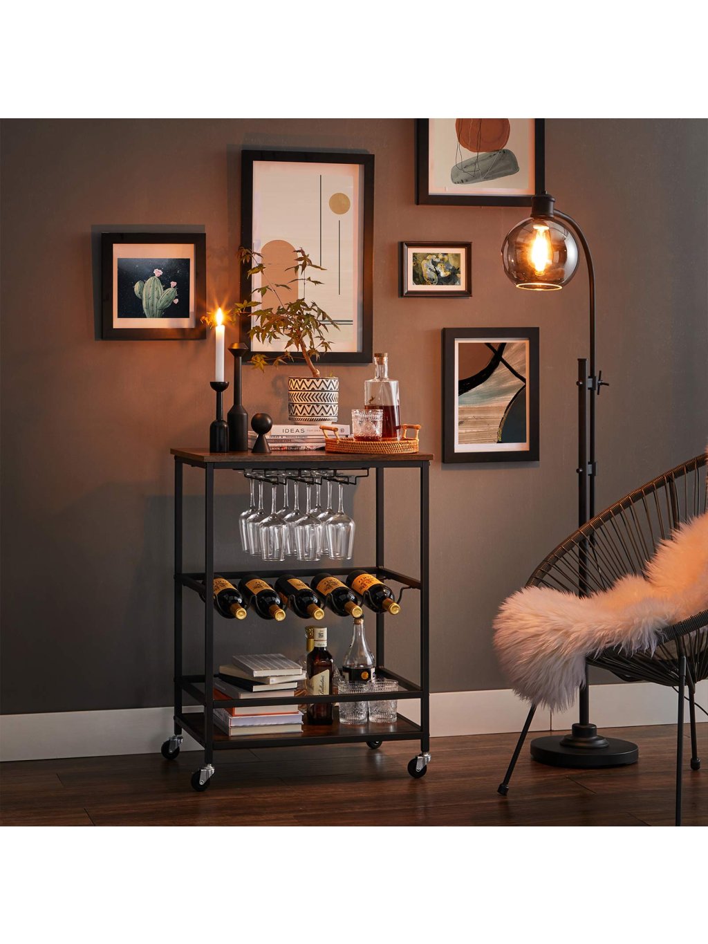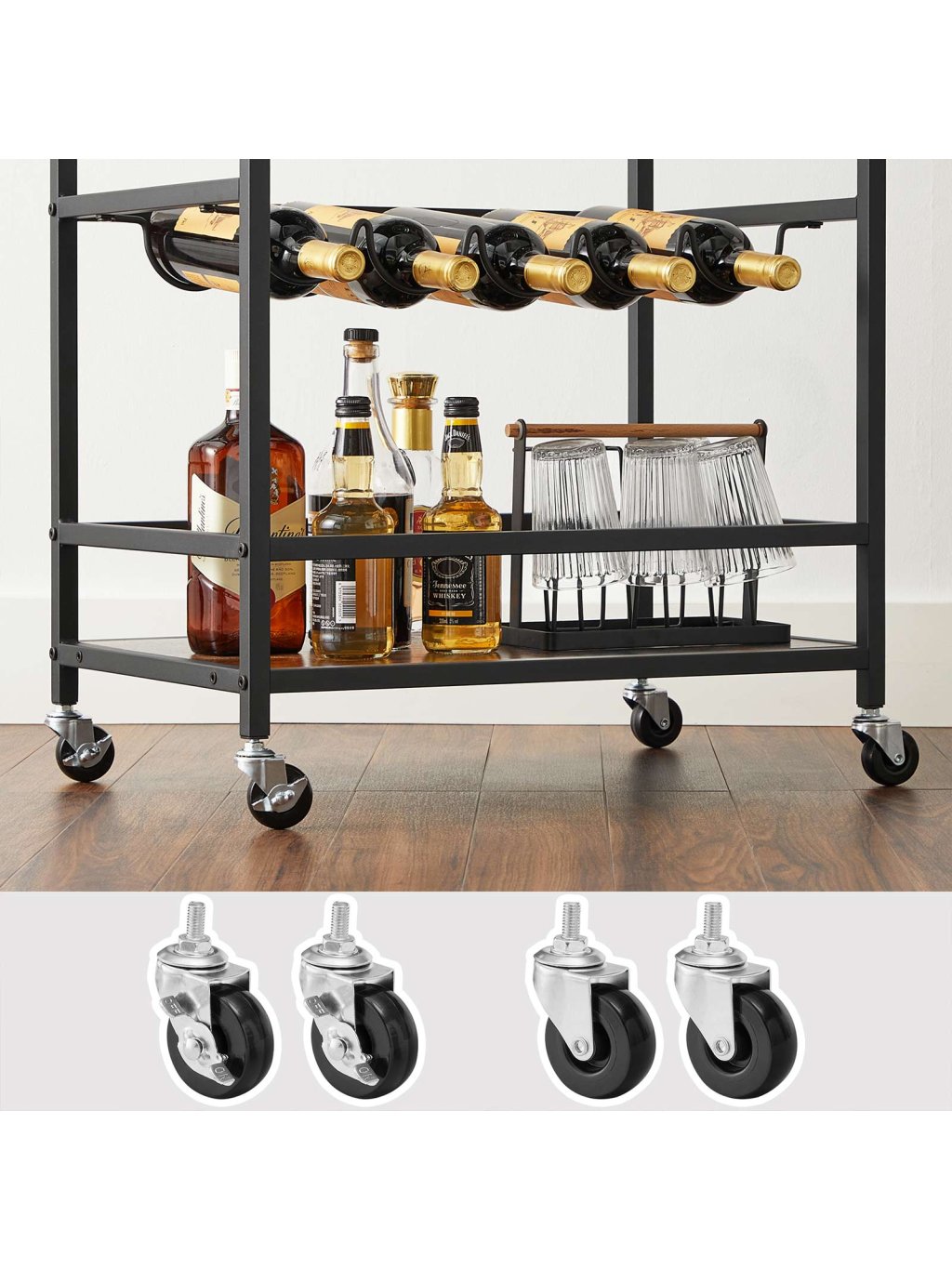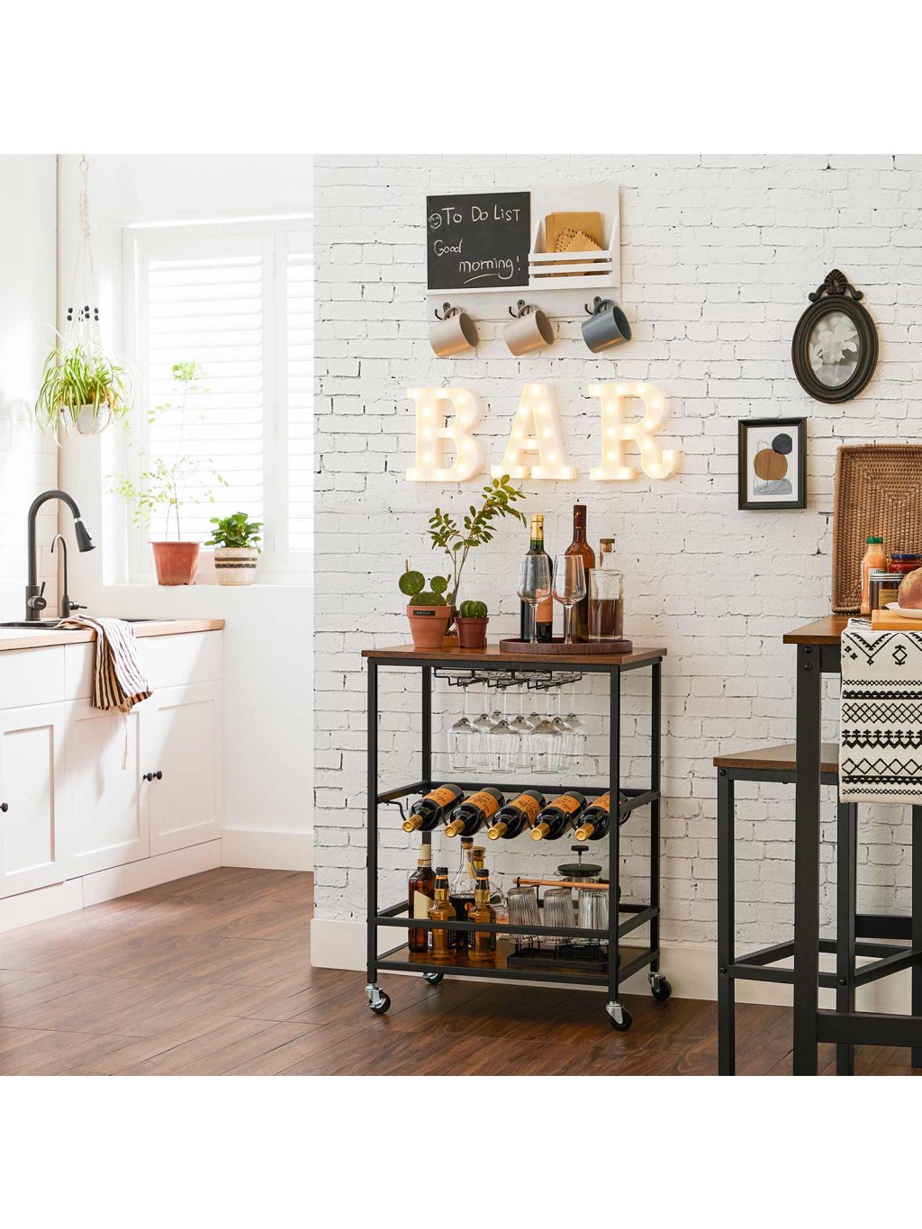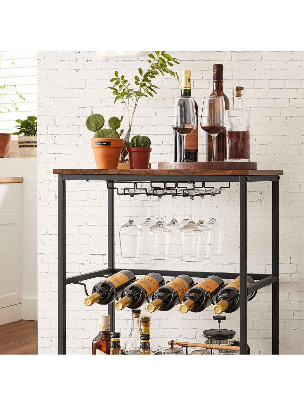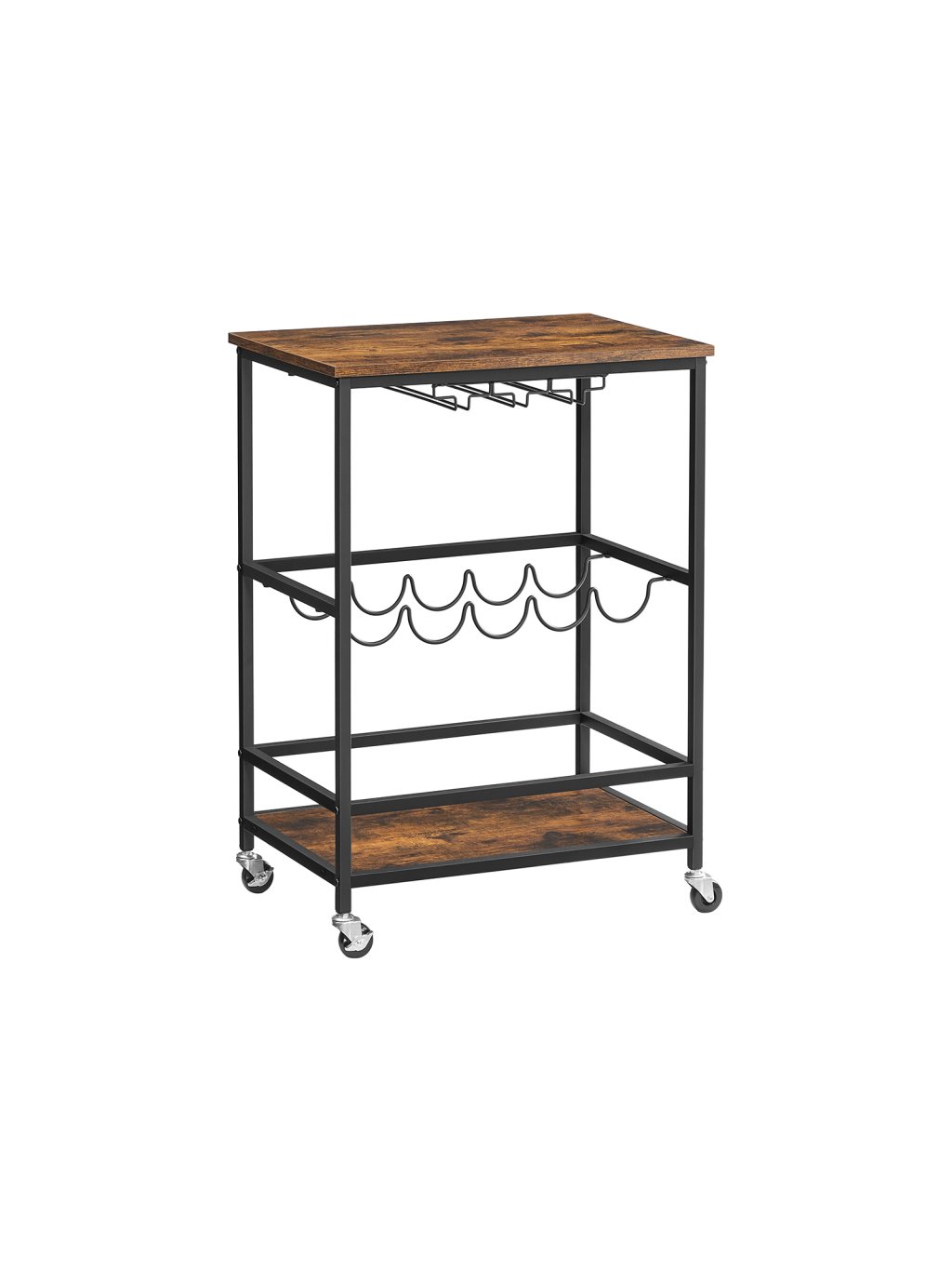 Tento pojízdný servírovací stolek je vybaven 3 držáky na sklenice na víno, 5 držáky na lahve, prostornou horní deskou a spodní policí. Skvěle poslouží jako domácí bar, kuchyňský vozík nebo úložný prostor pro mikrovlnku či občerstvení.