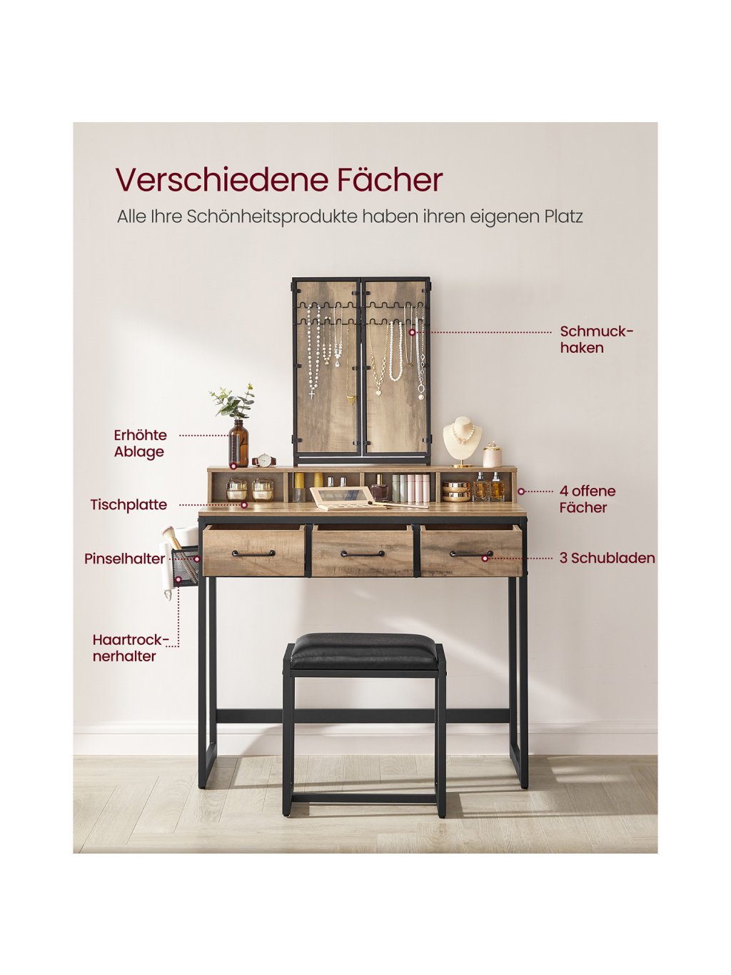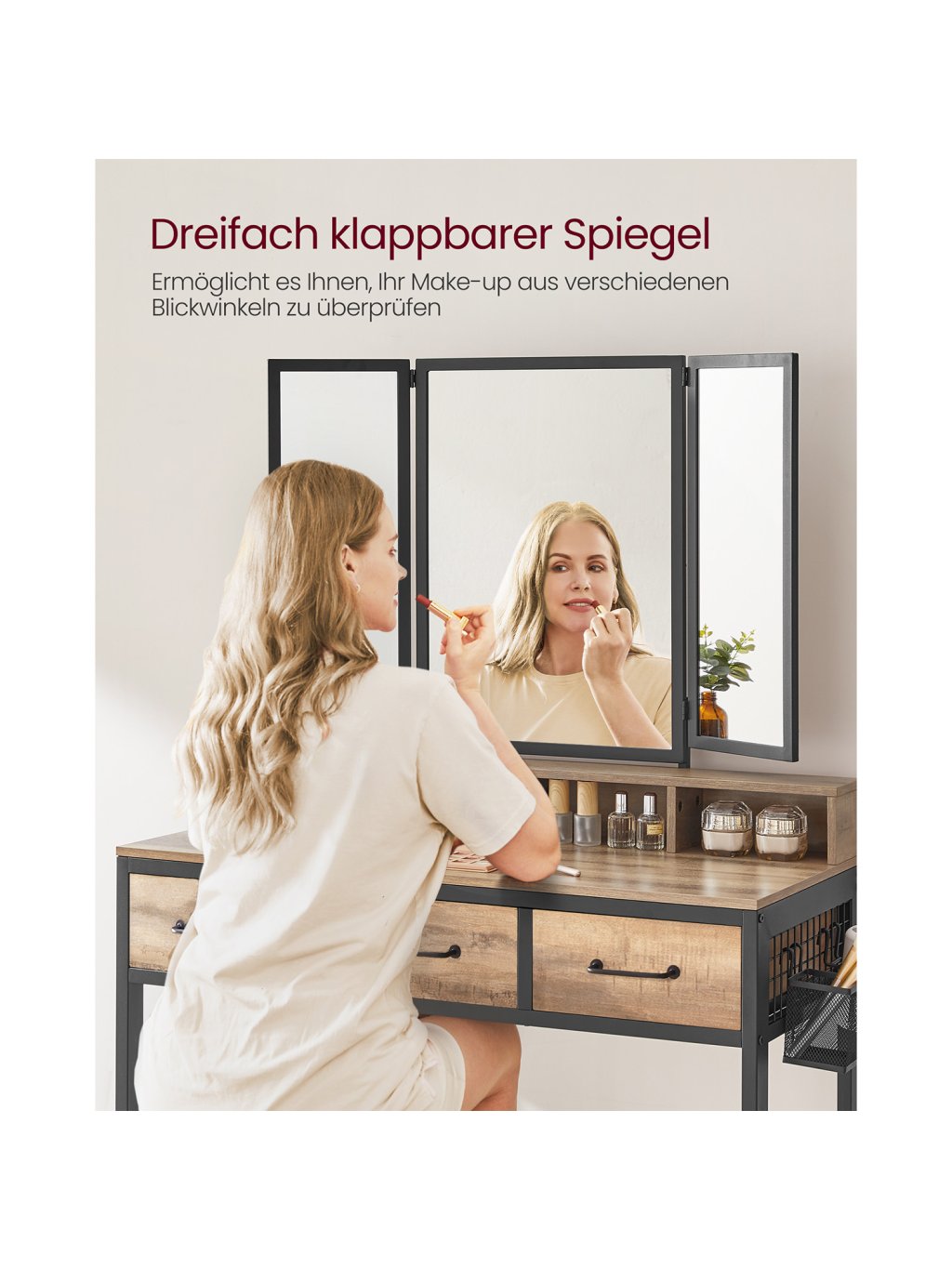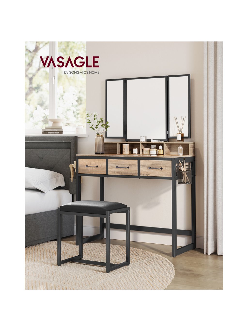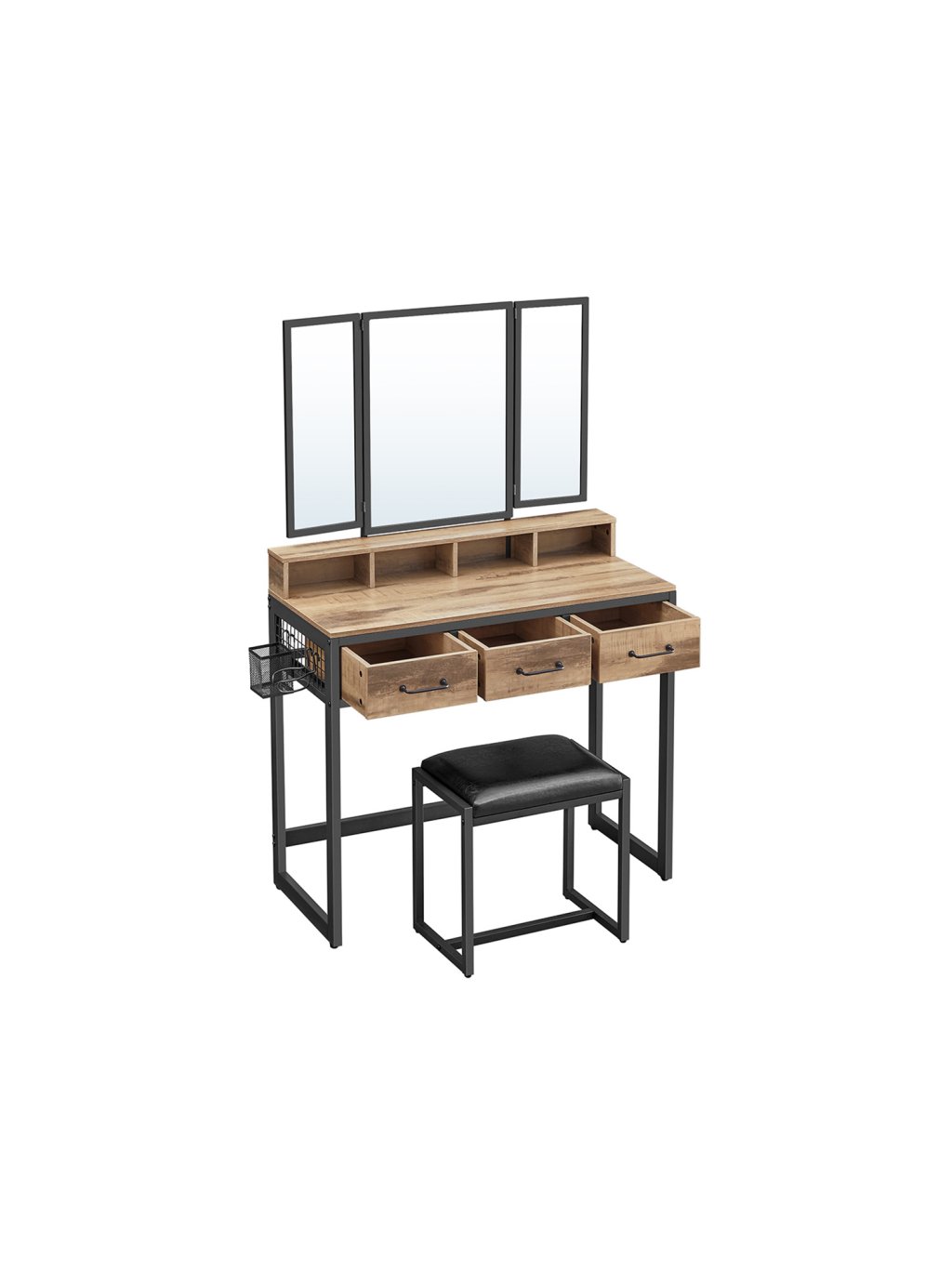 Elegantní kosmetický stolek s trojitým zrcadlem, robustní ocelovou konstrukcí, taburetem s polstrovaným sedákem a vším potřebným pro každodenní rituály krásy.