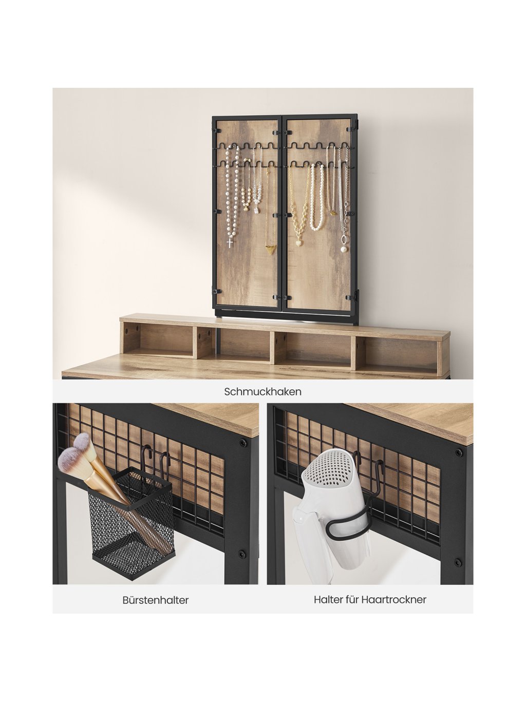 Na háčky za zrcadlem zavěsíte náušnice, náramky i náhrdelníky. Nechybí držák na fén a nádobka na štětce – vše prakticky po ruce.