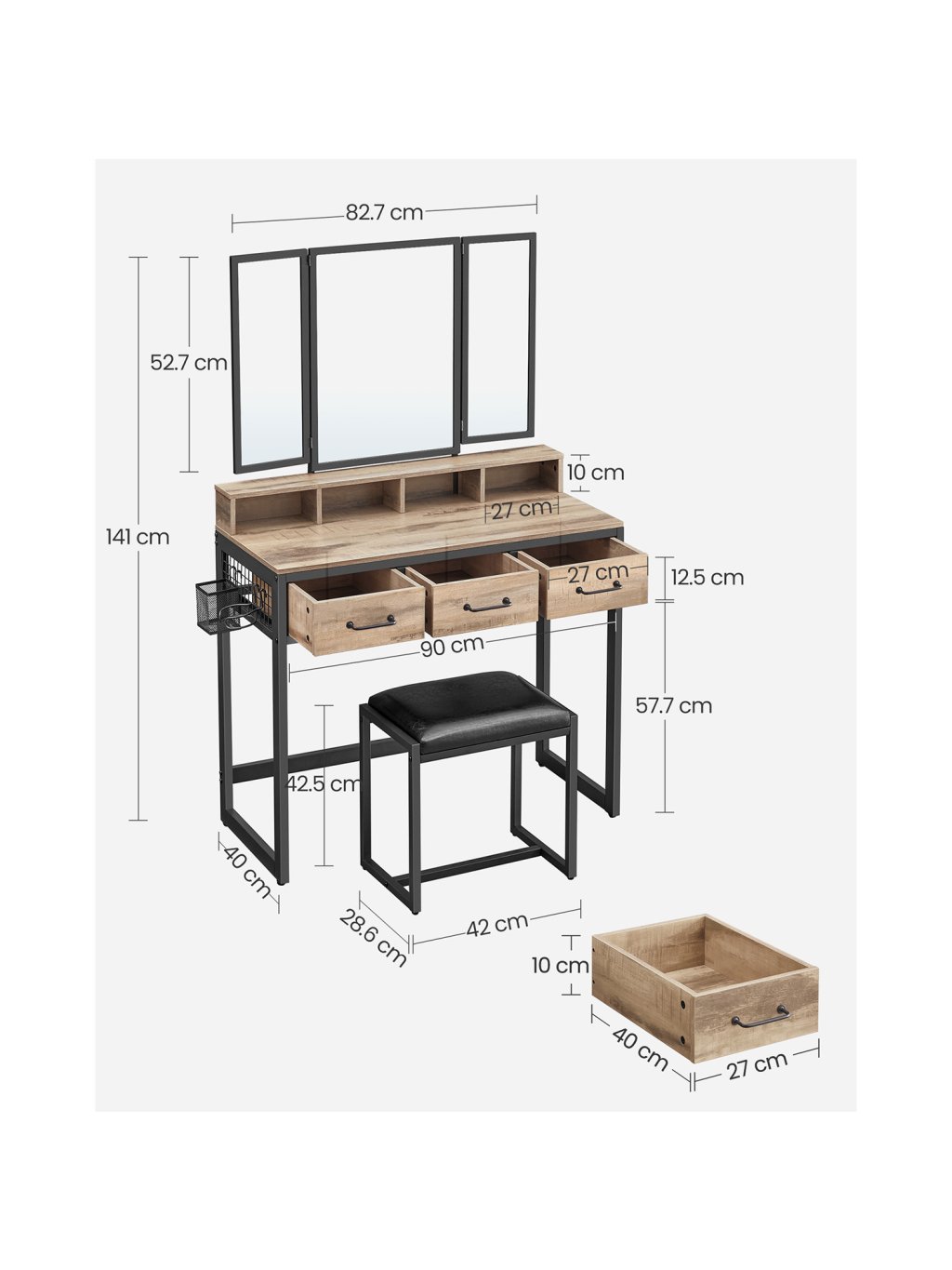Toaletní stolek s trojitým zrcadlem, zásuvkami a taburetem – dub/černý, 90 cm