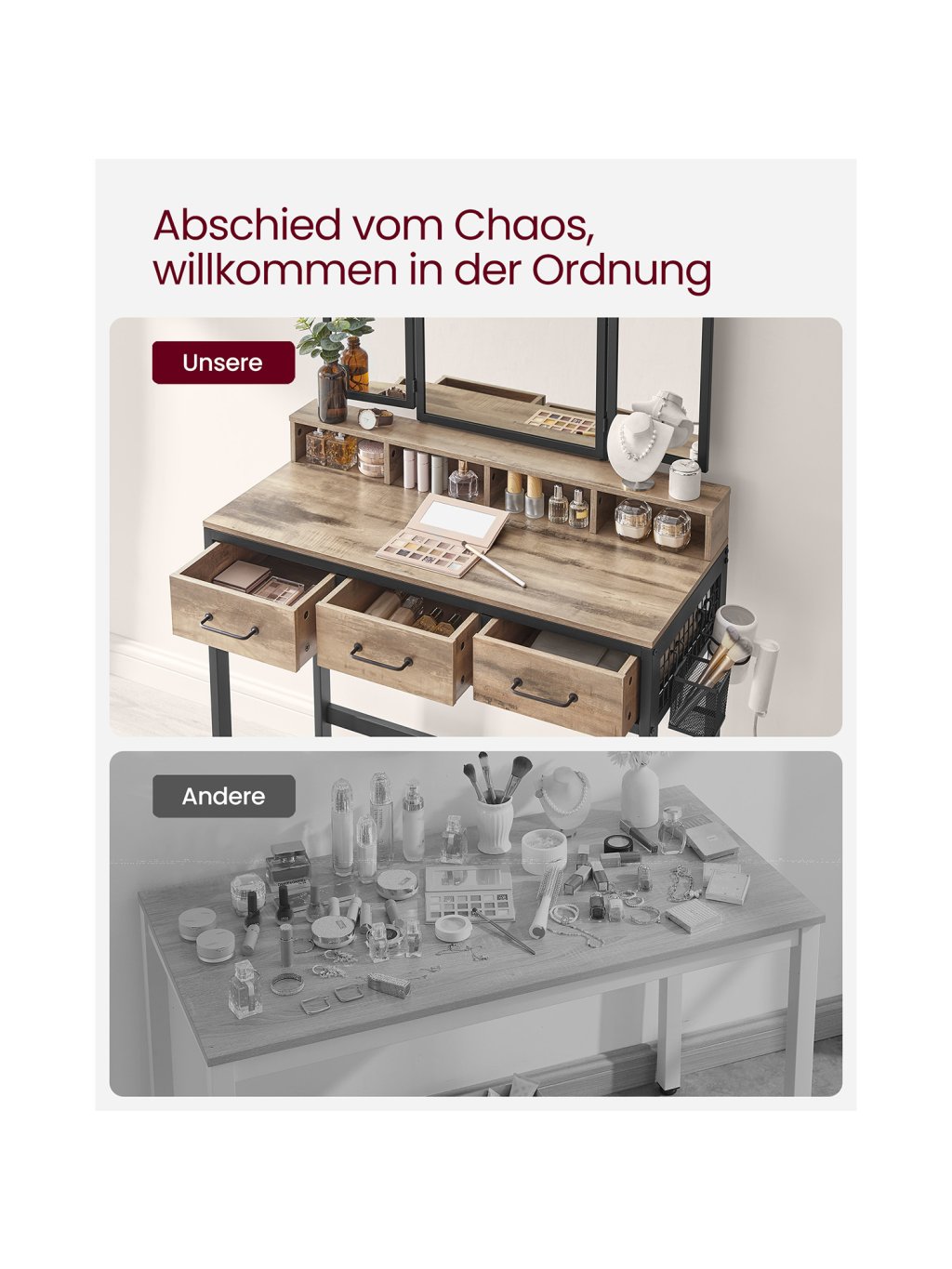 Vyvýšená plocha na parfémy, 4 otevřené přihrádky na rtěnky, 3 zásuvky na paletky či žehličky na vlasy a prostorná pracovní deska – tento kosmetický stolek nabízí dostatek místa pro vaši krásu bez nepořádku.