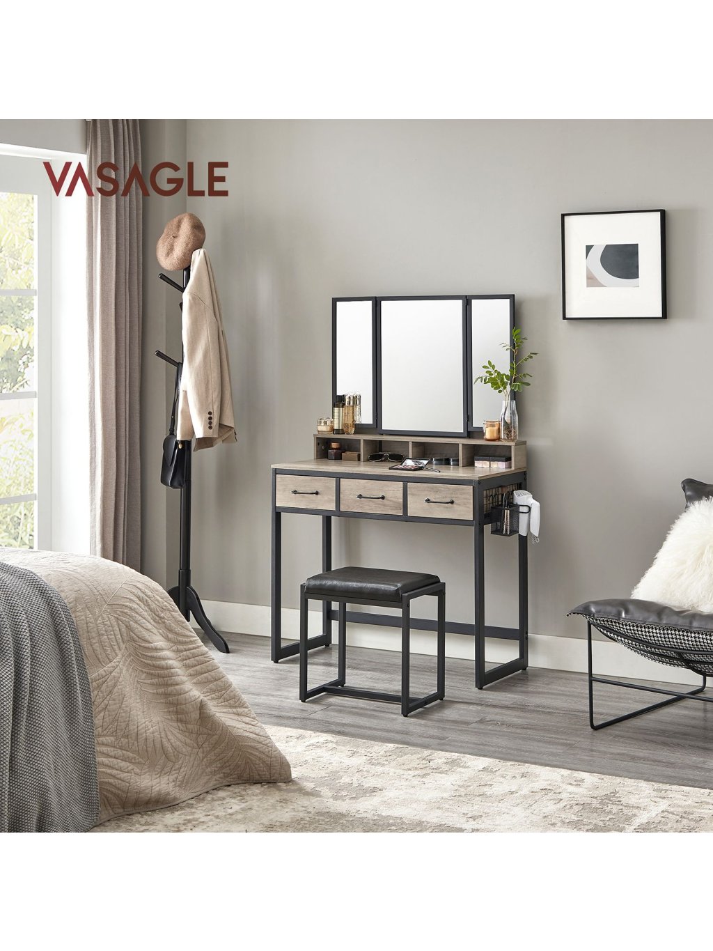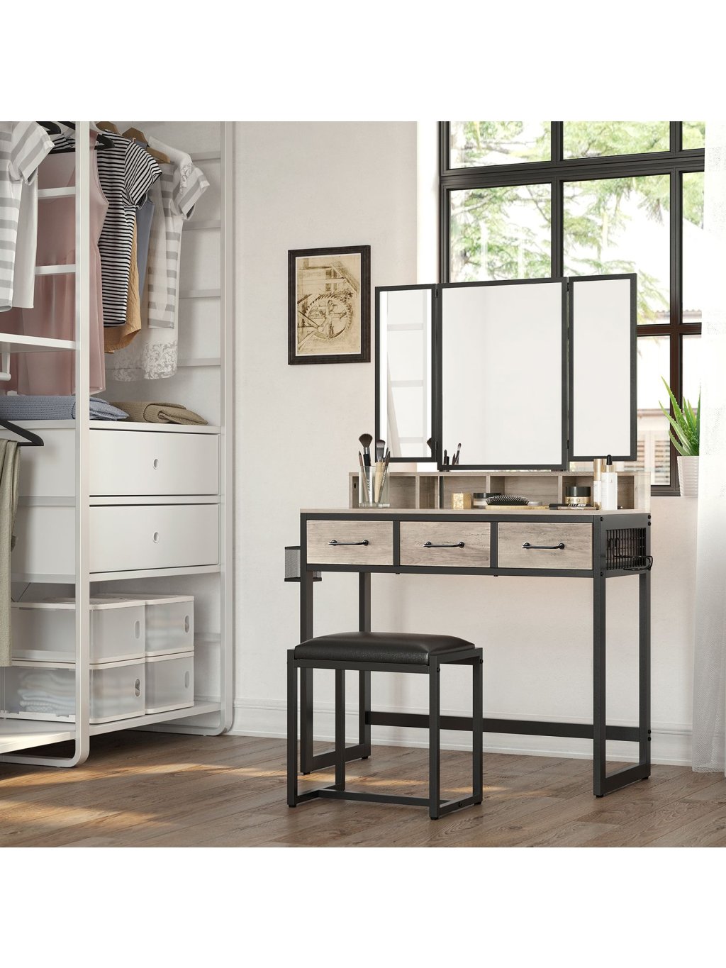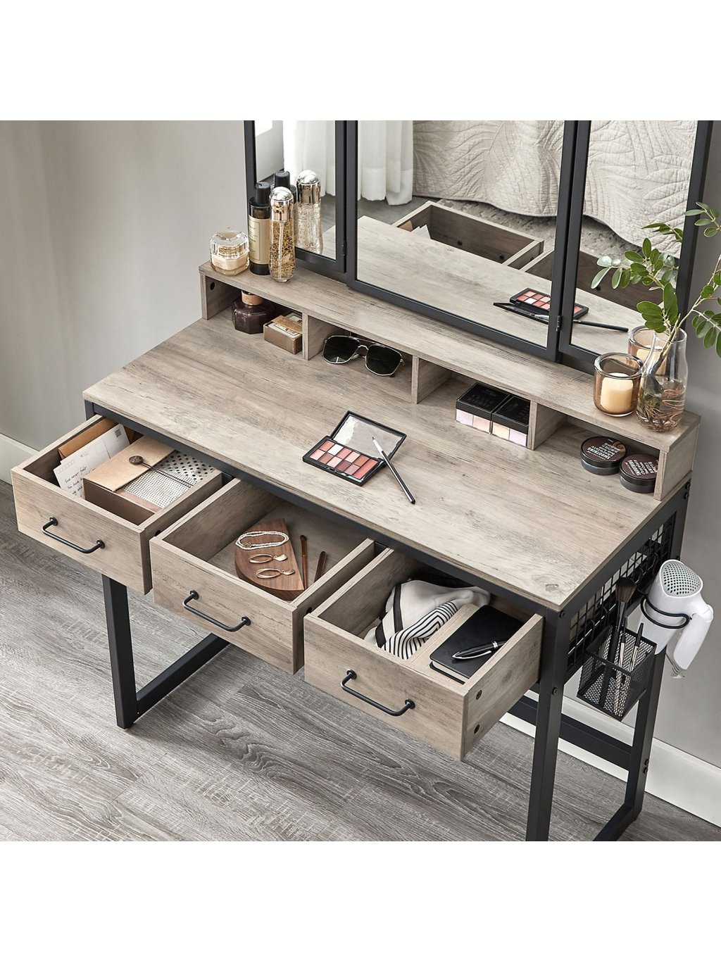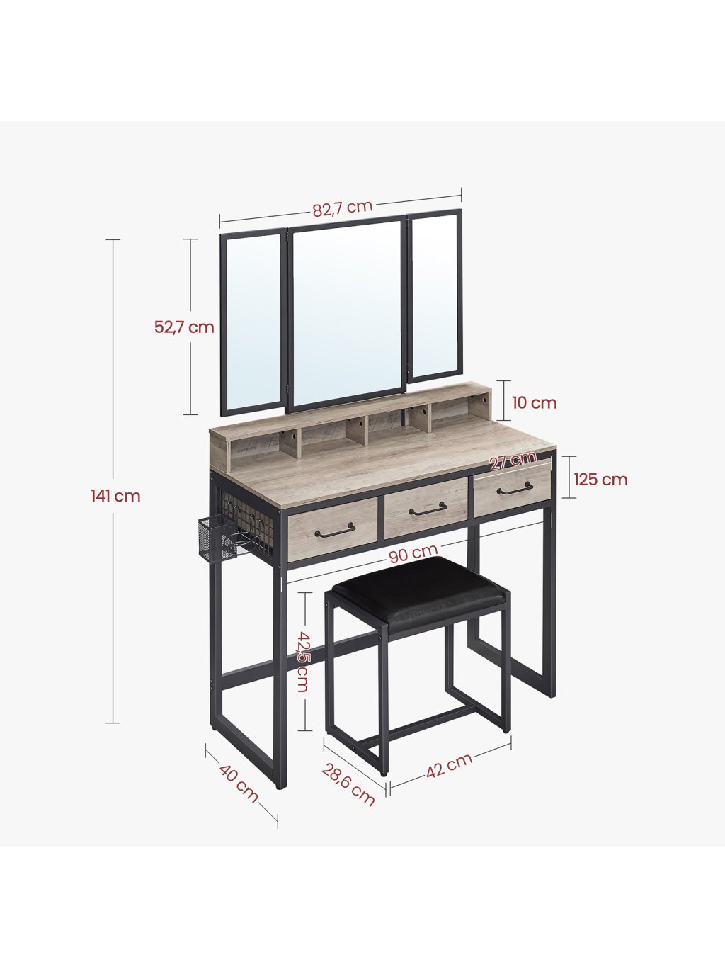 Toaletní stolek s trojitým zrcadlem, 3 zásuvkami a taburetem – šedobéžový/černý