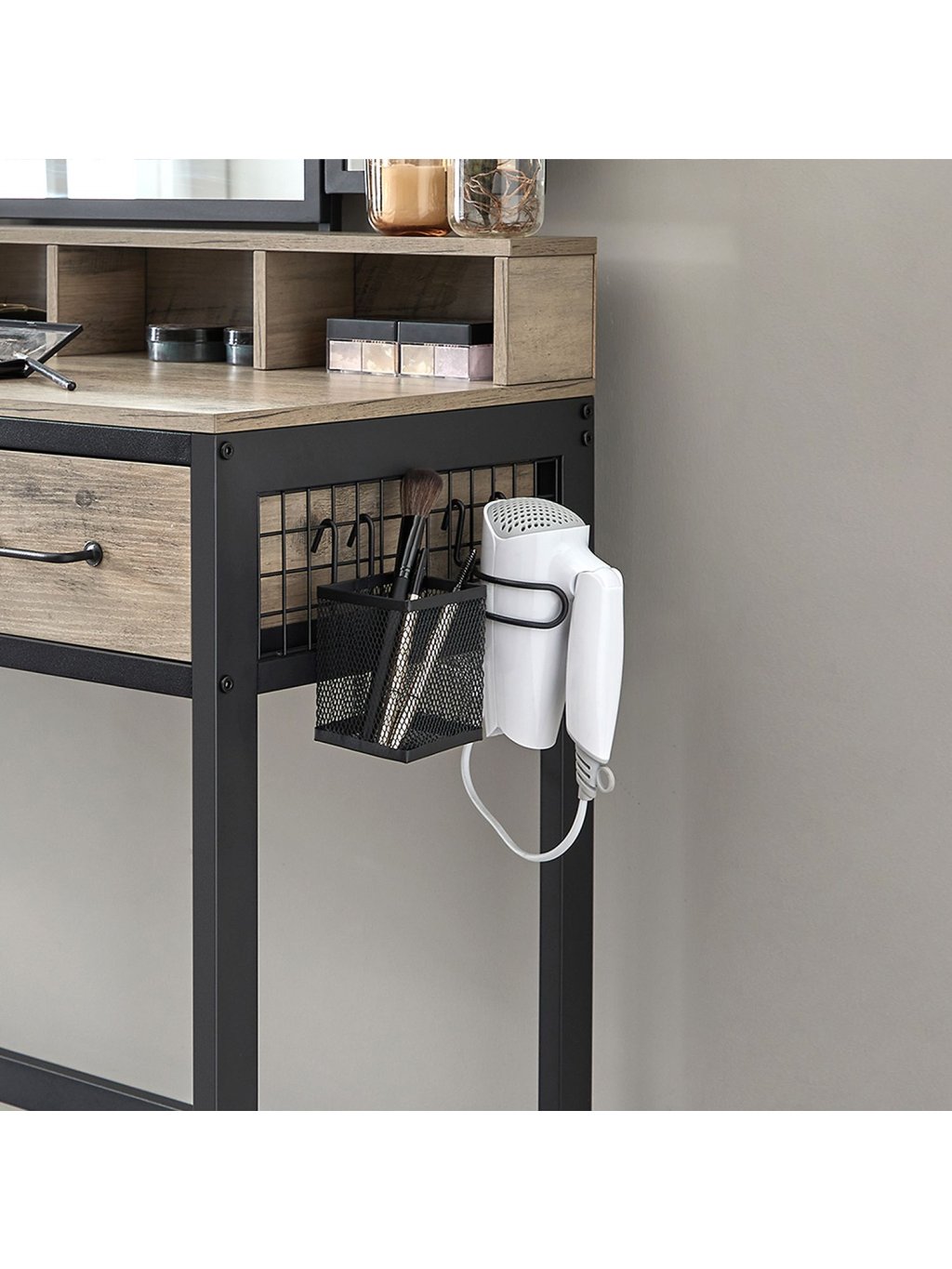 Elegantní žena se neobejde bez štětců, spon a dalších pomůcek. Proto má stolek 4 přihrádky pod zrcadlem, nádobku (8 × 8 × 10 cm) a držák na fén na boční straně – vše na dosah ruky.