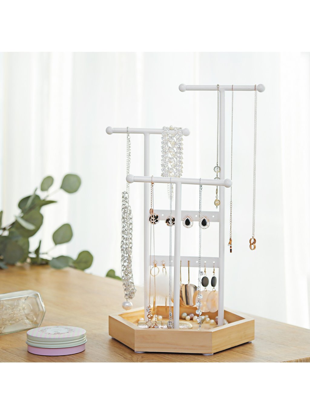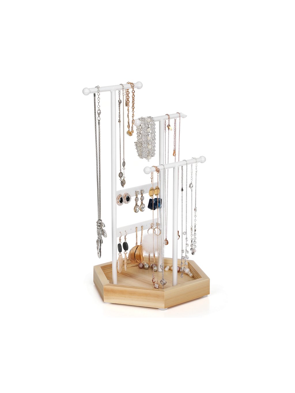 Stojan disponuje 3 T-tyčemi v různých výškách a 16 otvory na náušnice, prsteny, náramky i náhrdelníky. Vše má své místo – od drobných doplňků až po dlouhé šperky.