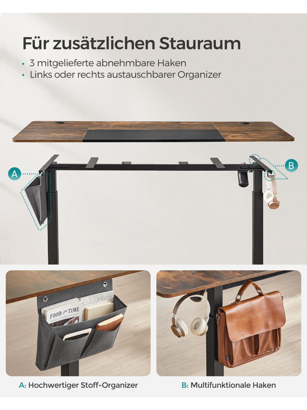 Textilní kapsa (umístitelná vlevo nebo vpravo) pro knihy a časopisy, 3 háčky na sluchátka nebo tašky a 2 průchody na kabely vám pomohou udržet pracovní plochu přehlednou.
