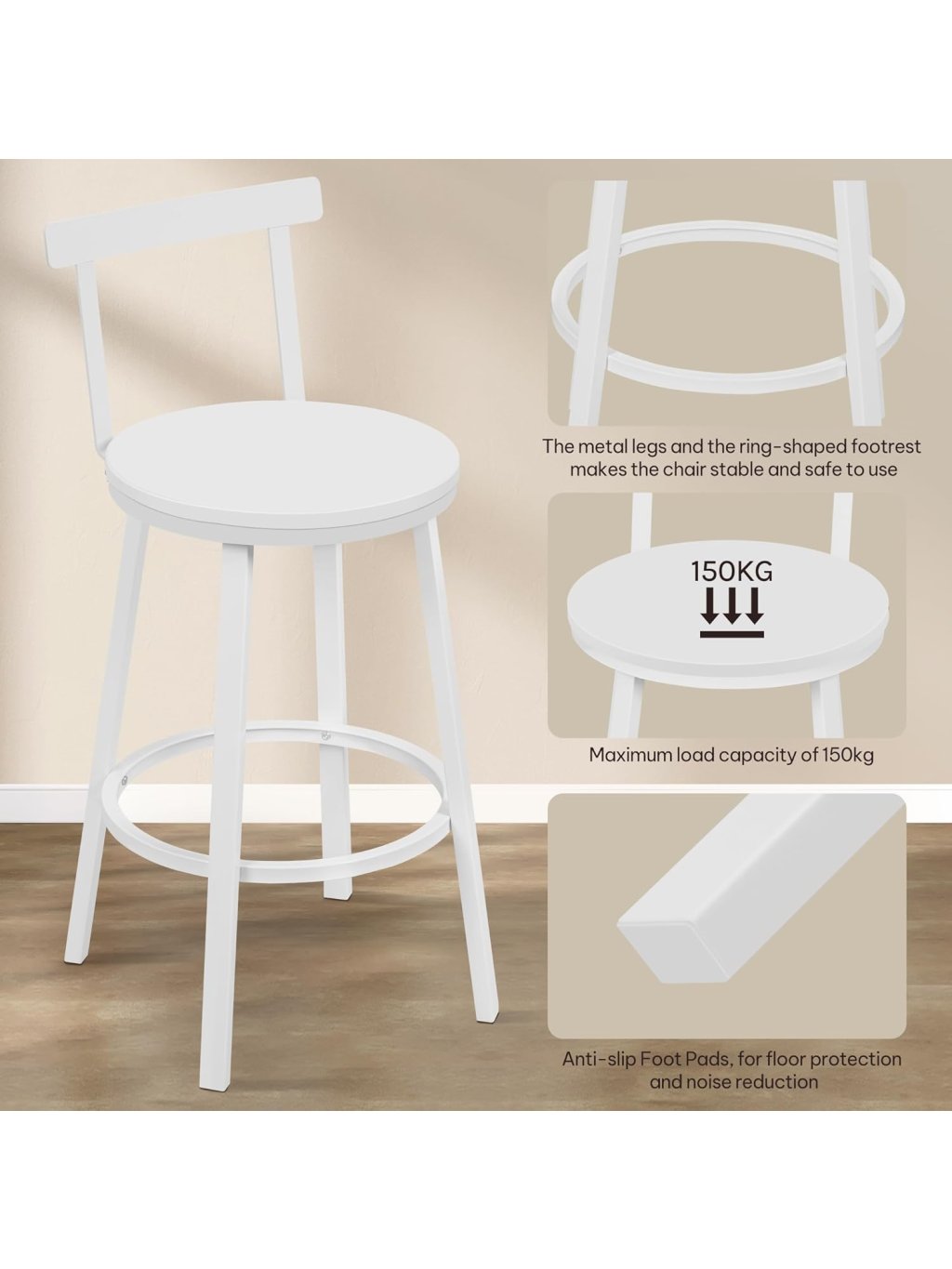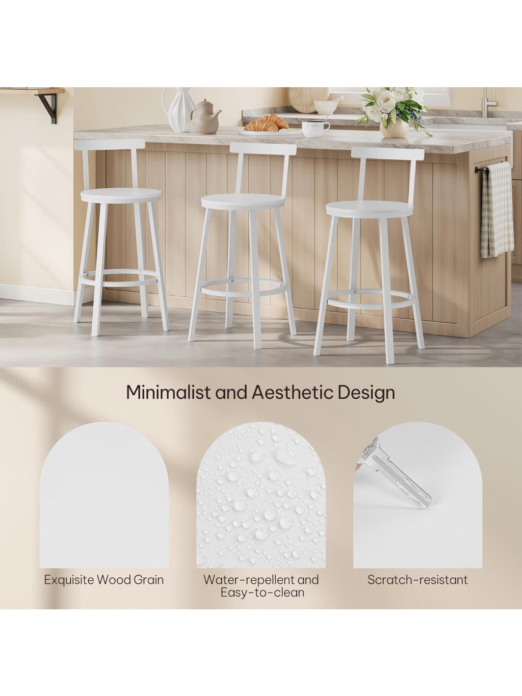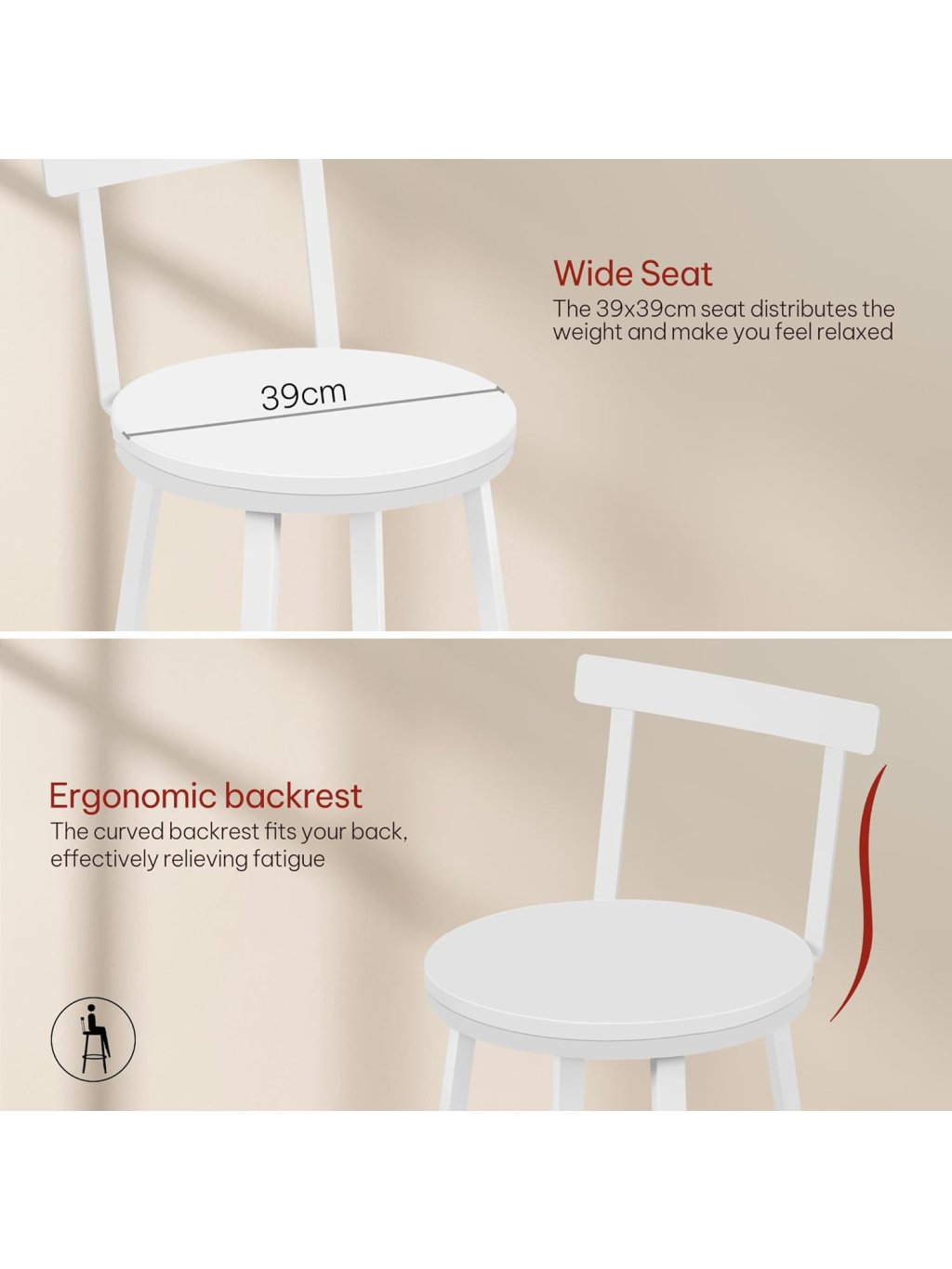 Moderní a odolné barové židle WOLTU BH430ws spojují jednoduchý skandinávský styl s maximální funkčností. Jsou ideální pro kuchyňské ostrůvky, bary, kavárny nebo restaurace. Díky pevnému kovovému rámu, ergonomickému designu a snadno udržovatelnému sedáku z MDF nabízejí komfort i stabilitu.